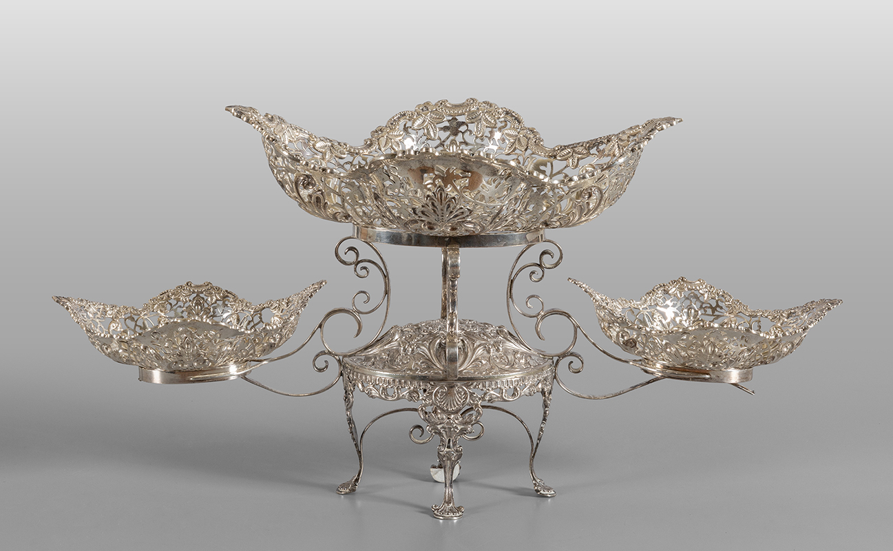 Centrotavola in argento sterling con tre vaschette rimovibili traforate