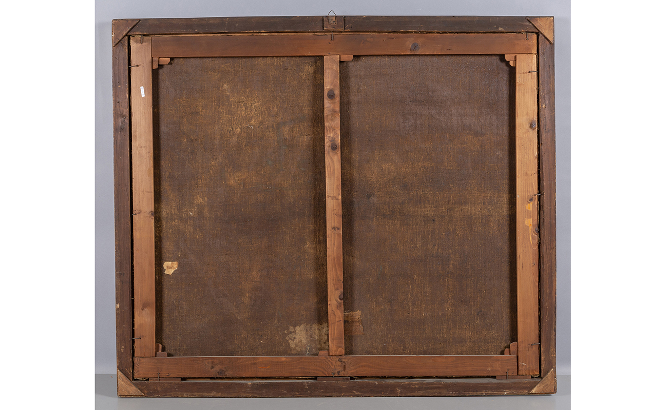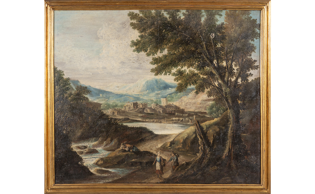 Scuola cremonese inizi sec.XVII 'Strada con viandanti fiume e città' olio