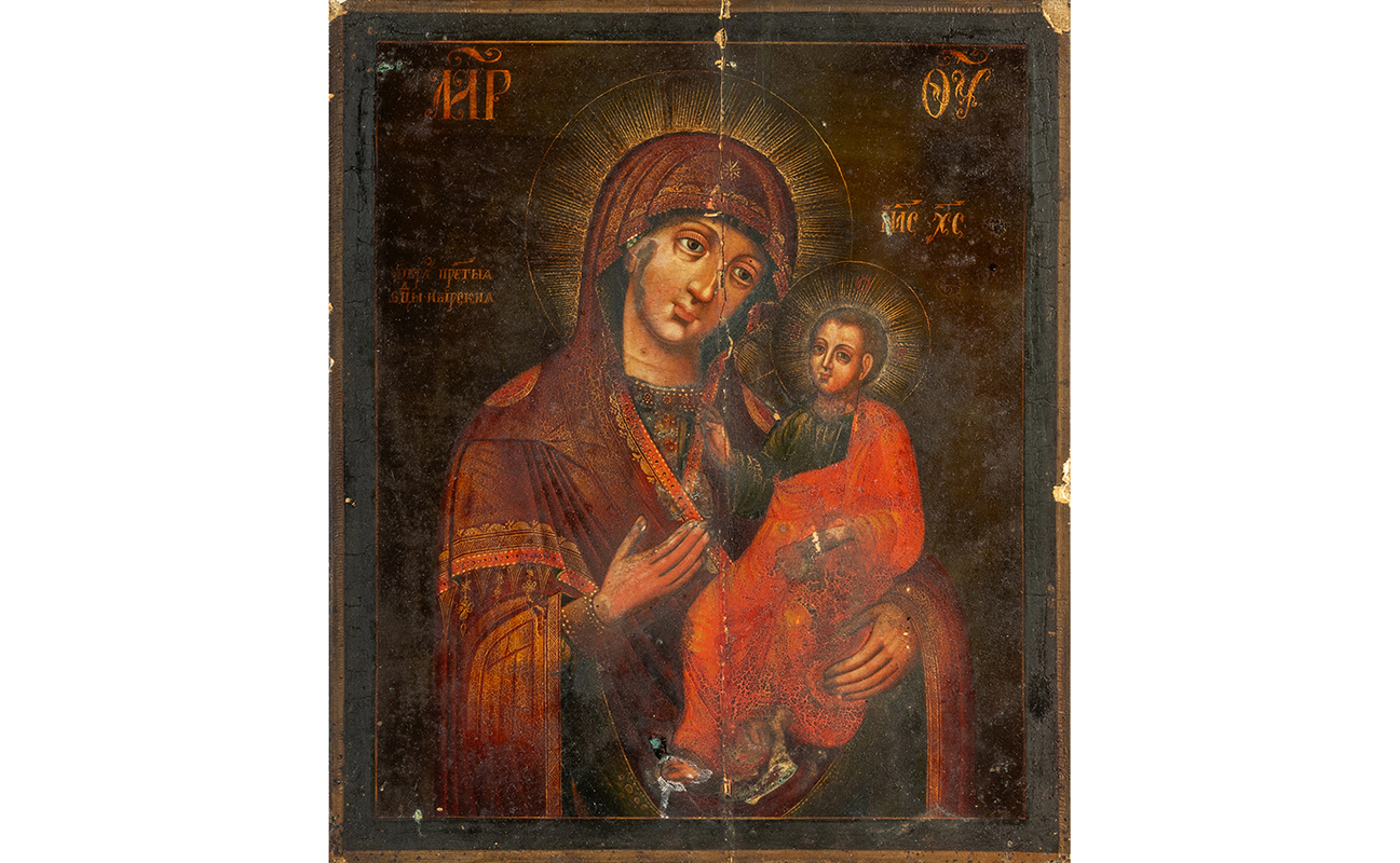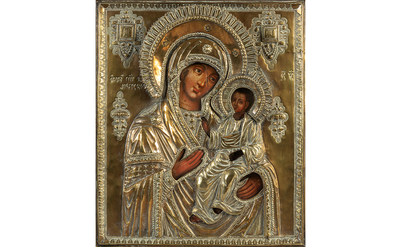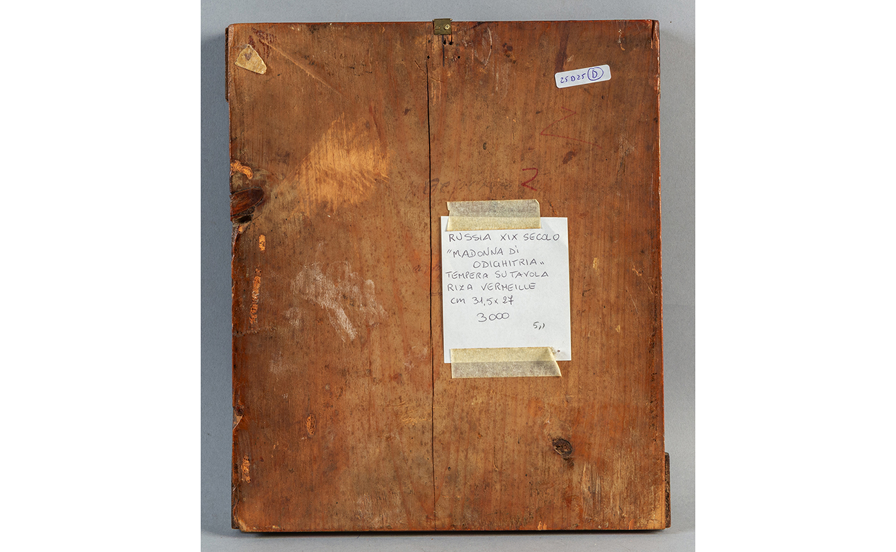 'Madonna Odigitria' icona tempera su tavola con riza in metallo Russia sec.XIX