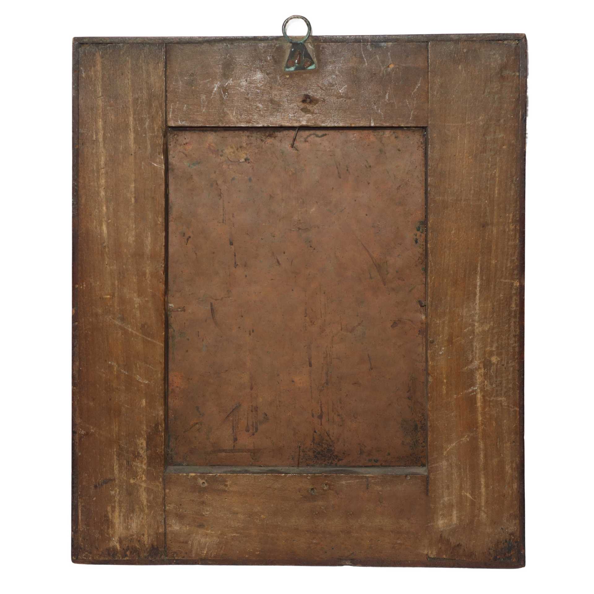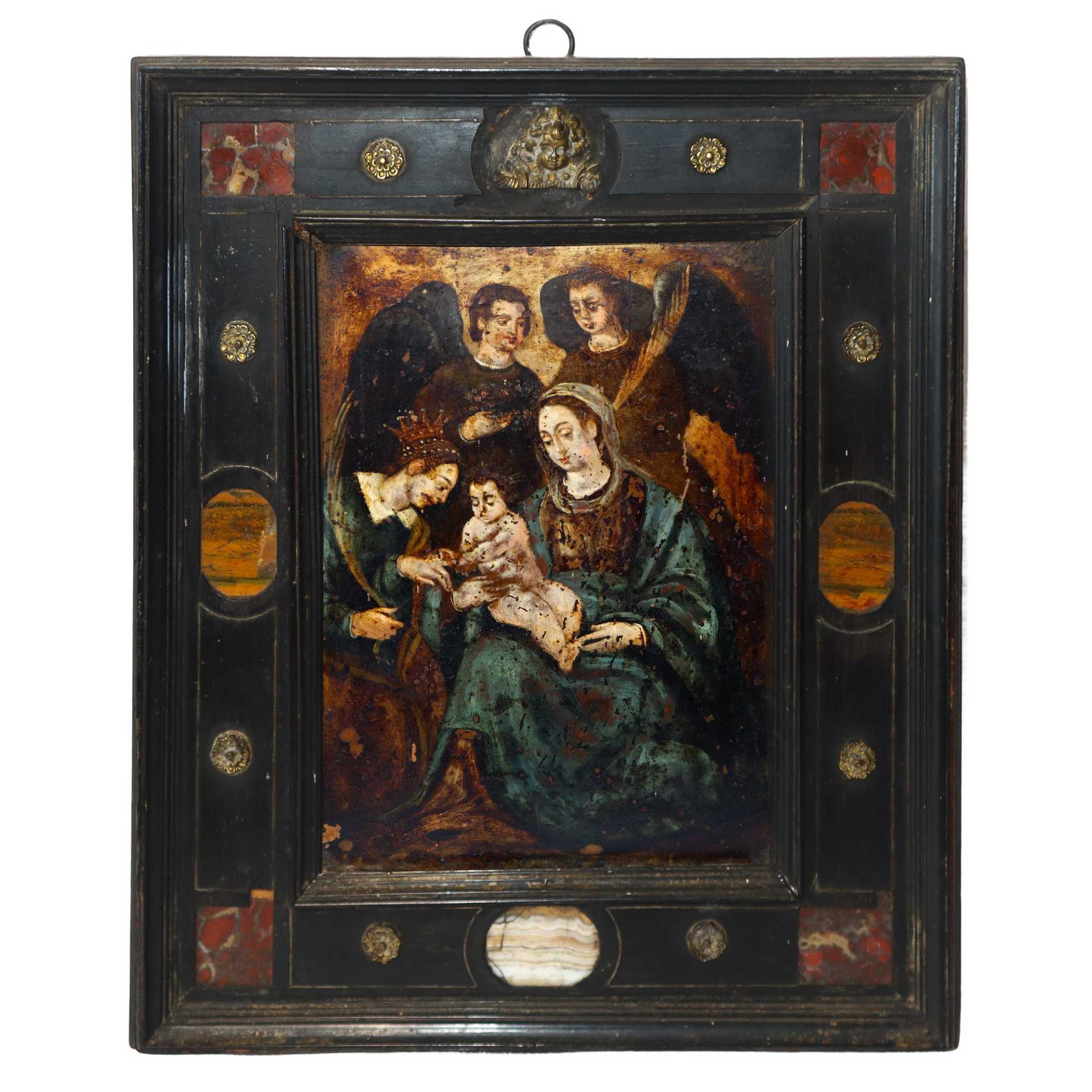 Piccola natività con due angeli, fine 17° secolo h cm 22X16,5 in cornice h cm 34X29 olio su rame Cornice nera ebanizzata e inserti in marmo di Siena, marmo di Verona e agata. Bambino Gesù in bronzo dorato applicato in testa alla cornice e fiori dorati ai bordi.