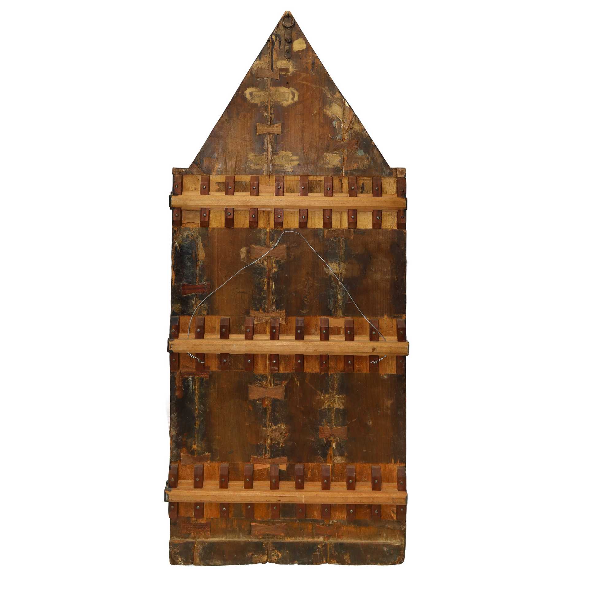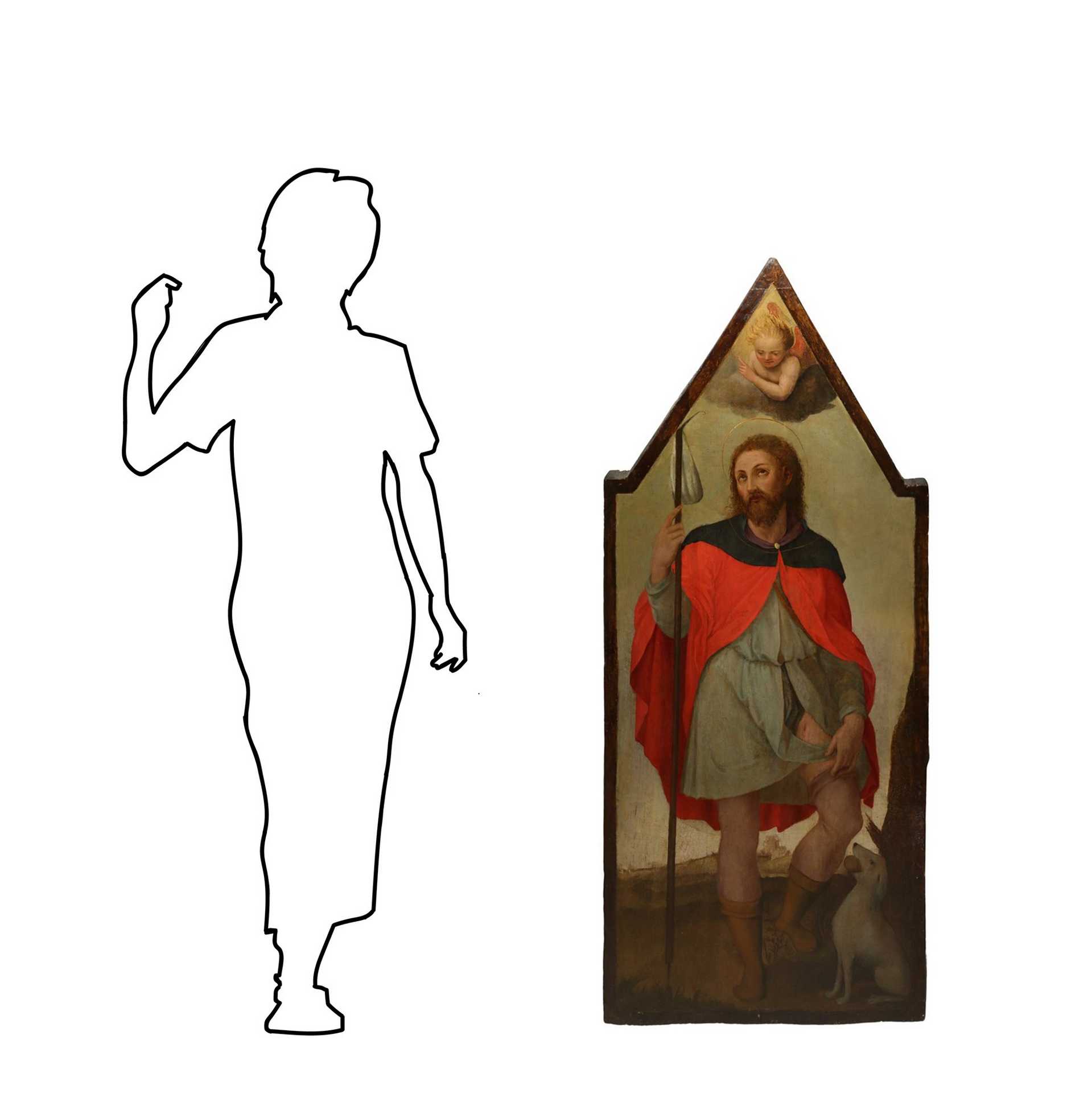 Francesco Zaganelli (attribuito a) (Cotignola 1460 - Ravenna 1532) - San Rocco, 15°/16° secolo h cm 150X61 profondità della tavola cm 2,5 tempere grasse su tavola cuspidata Opera attribuibile all'area degli Zaganelli. Questo delizioso pannello è probabilmente parte di una struttura più ampia atrribuibile a Francesco Zaganelli, attivo in area ravennate. Possiamo fare riferimento alla Santa Lucia dello stesso Zaganelli il cui stile può essere raffrontato all'opera in questione. Molto probabilmente risale al periodo della sua venuta in Veneto, chiamato a Vicenza a dipingere la Madonna della rose; durante questo soggiorno risente degli influssi veneti e sicuramente viene a contatto con le influenze dureriane di cui la nostra opera in qualche modo risente. L'opera può essere datata intorno ai primi anni del '500, in quanto fino al 1509 lo Zaganelli lavora esclusivamente a tempera