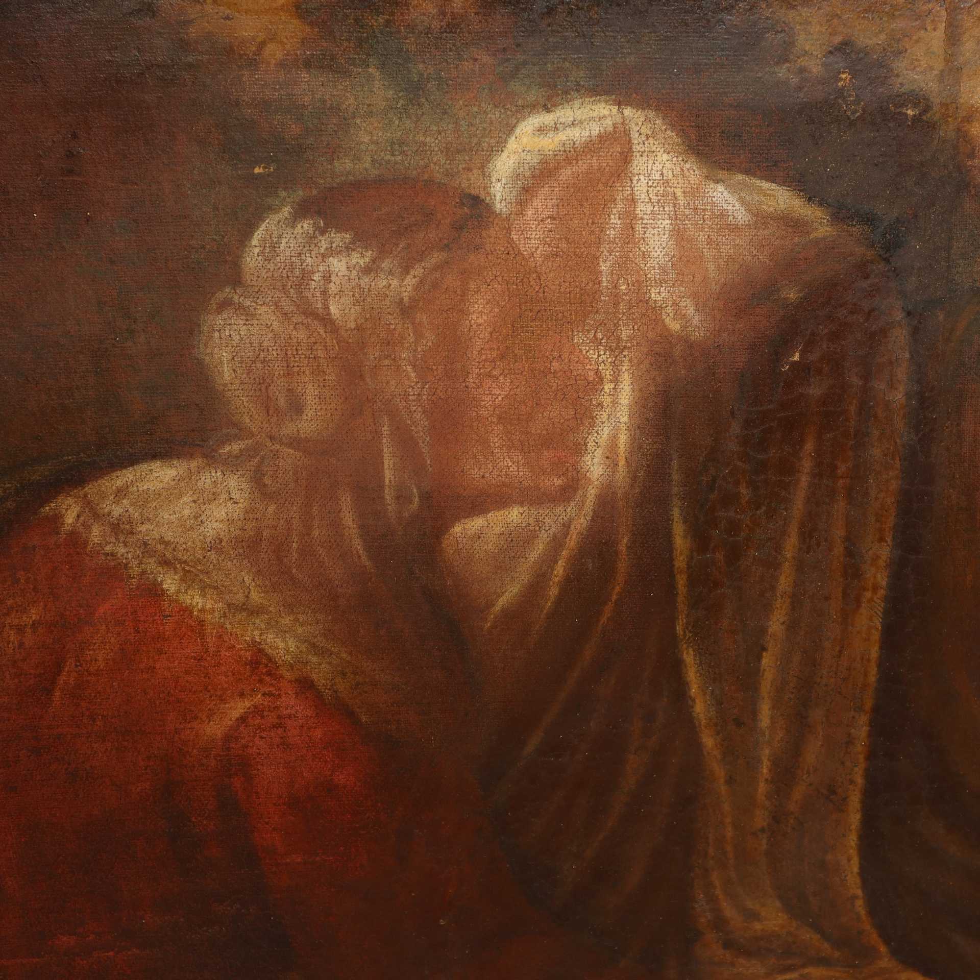 Scena biblica: Vengono mostrati i panni insanguinati di Giuseppe a Giacobbe dopo essere stato gettato nel pozzo dai fratelli, primi 18° secolo H CM 74x100 in cornice h cm 81X117 olio su tela
