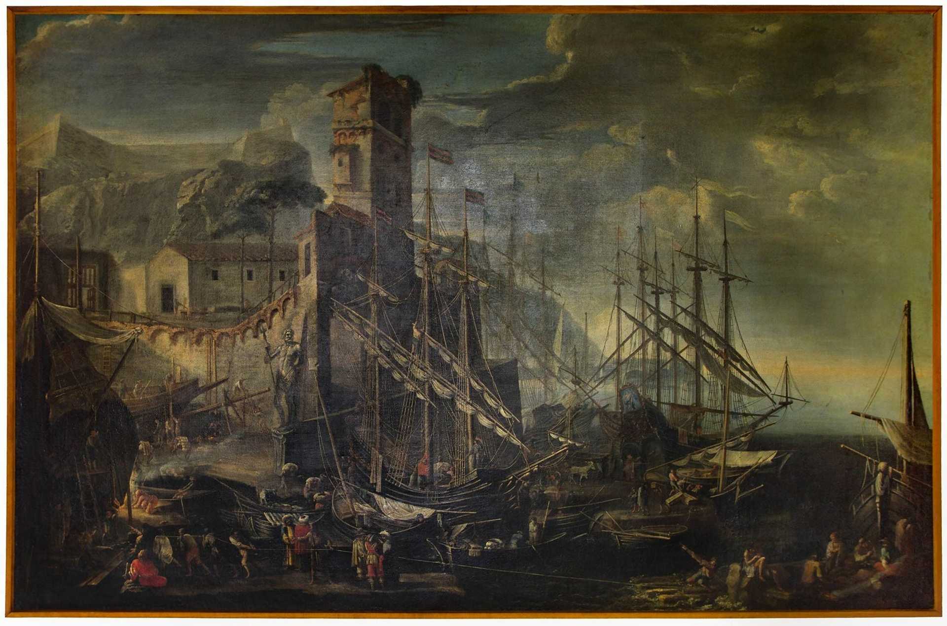 Cornelis De Wael (Anversa 1592 - Roma 1667) - Capriccio di un porto fortificato con arsenale e personaggi h cm 161X245 olio su tela L’opera in questione è una veduta di una baia portuale con banchina in piena attività dinamica, con mercanti, operai, viaggiatori e arsenale operativo.