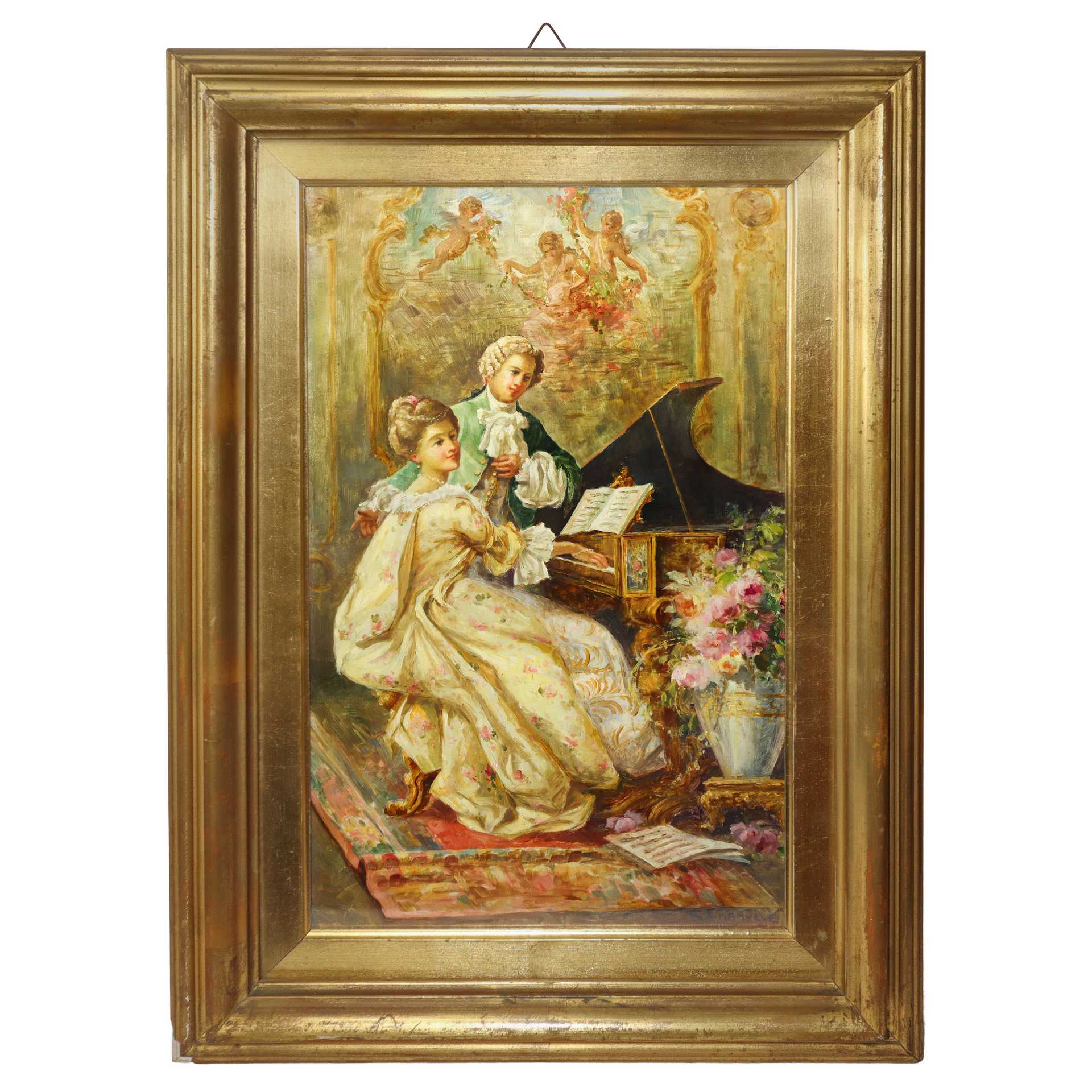 Gaetano Emanuele (Catania 1876 - 1953) - Scena galante con dama al piano, fine 19° secolo h cm 44,5X28 in cornice h cm 58,5X42,5 Olio su tavola Firmato in basso a destra