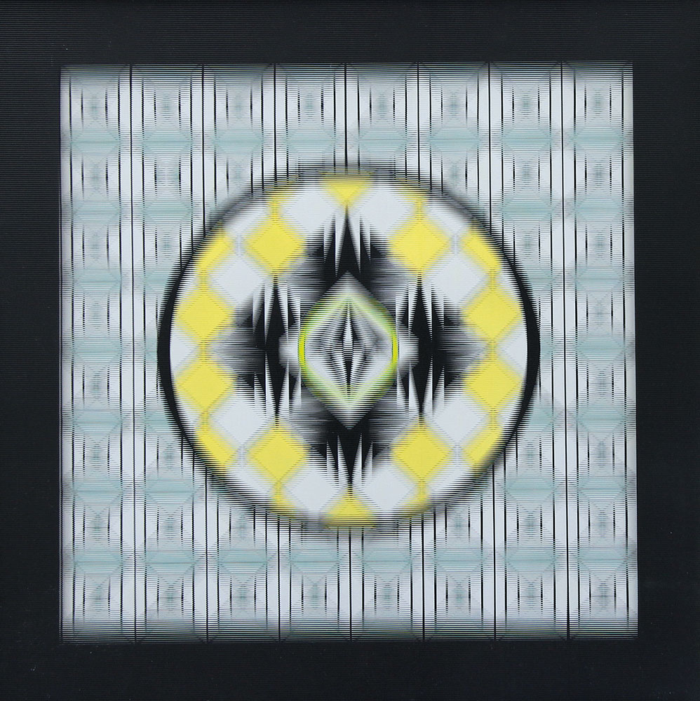 tecnica mista su cartoncino con copertura in plexiglass zigrinato a linee orizzontali cm. 50x50, firma, titolo, anno, località (Venezia), etichetta e timbro dell'artista al retro.