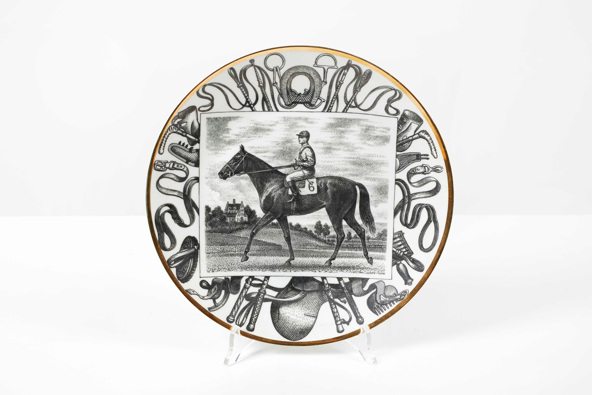 PIERO FORNASETTI (Milano 1913 – Milano 1988) "Grandi Campioni italiani del galoppo". Anni '60. Porcellana decorata a serigrafia e bordo dorato. Cm 26 Ø. Prod. Fornasetti, Italia. Al retro recano marchio Fornasetti, Milano, Made in Italy.