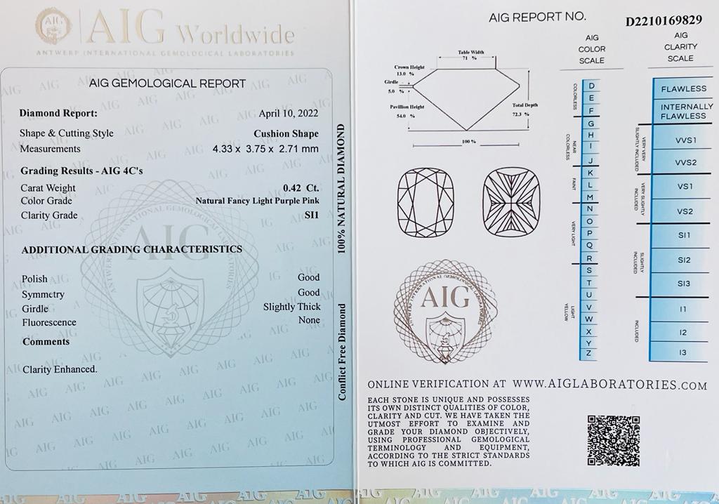 DIAMANTE NATURAL POLISHED 0,42 - COLORE NATURAL FANCY ROSA VIOLA CHIARO - PUREZZA SI1 - CERTIFICATO AIG - F20413 - COMMISSIONE D’ASTA 25%