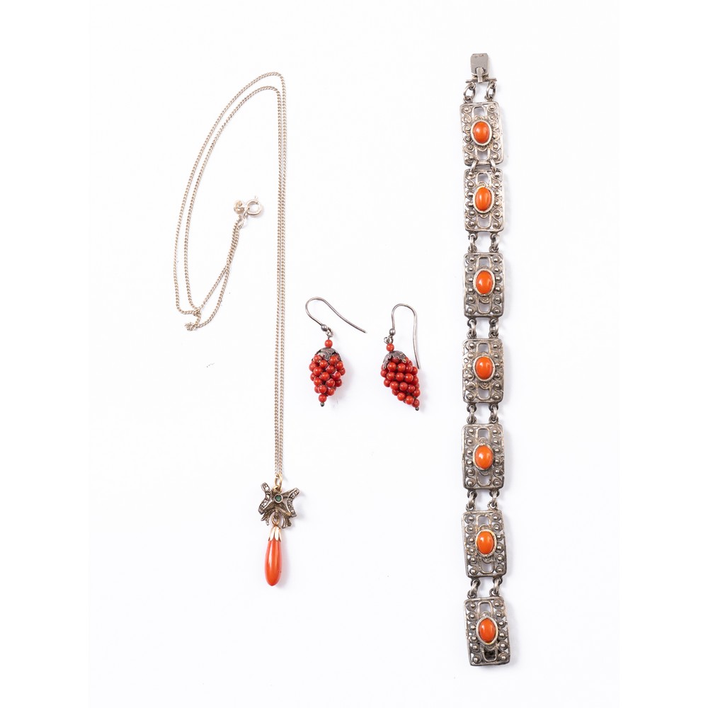 Collana in argento 925 con pendente in oro giallo 9 KT e argento con diamanti ct. 0,03 peso di stima, smeraldo ct. 0,02 peso di stima e corallo; bracciale e orecchini in argento e corallo (g. 29,00).