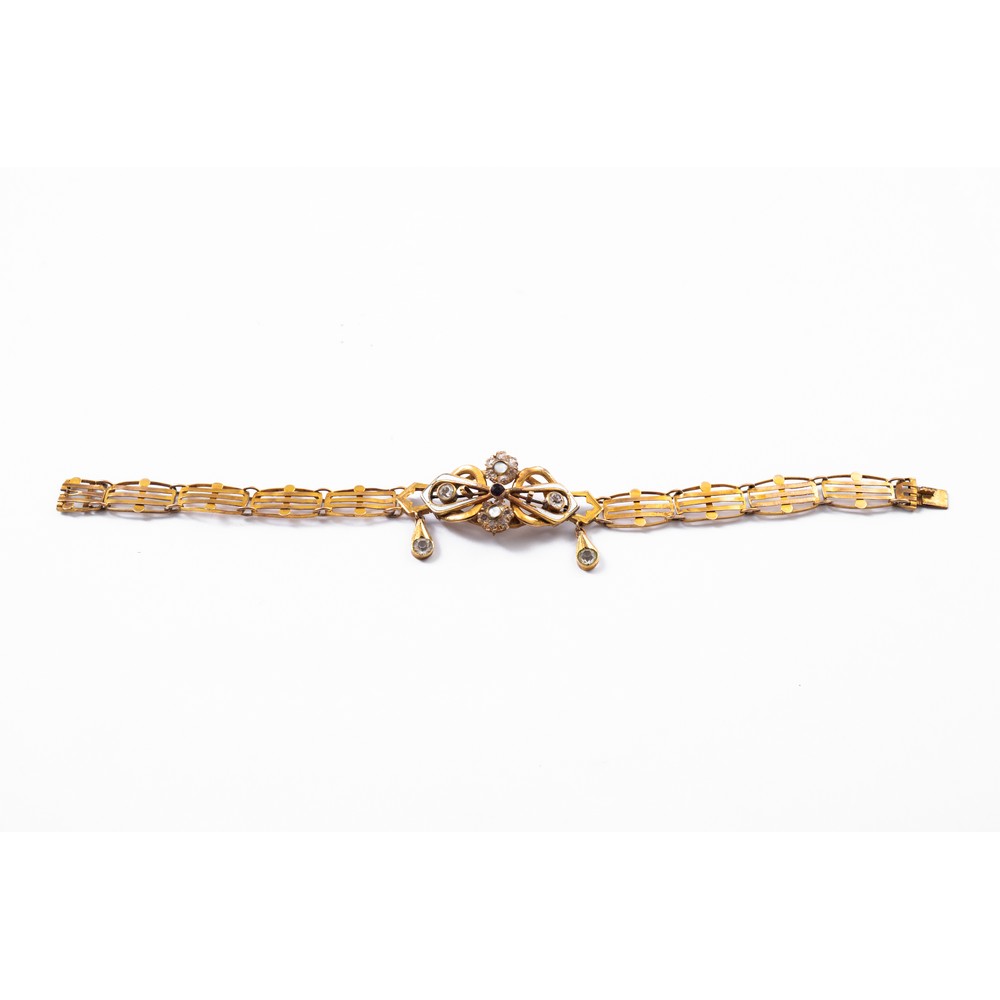 BRACCIALE in oro giallo 9 KT con zaffiri bianchi, madreperle, granato e smalti bianchi (g. 8,80) (usure).