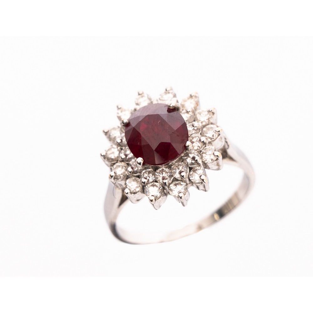 ANELLO in oro bianco 18 KT con diamanti taglio brillante ct. 0,90 peso di stima I COLOR VS1 e rubino ct. 1,50 peso di stima (g. 6,20).