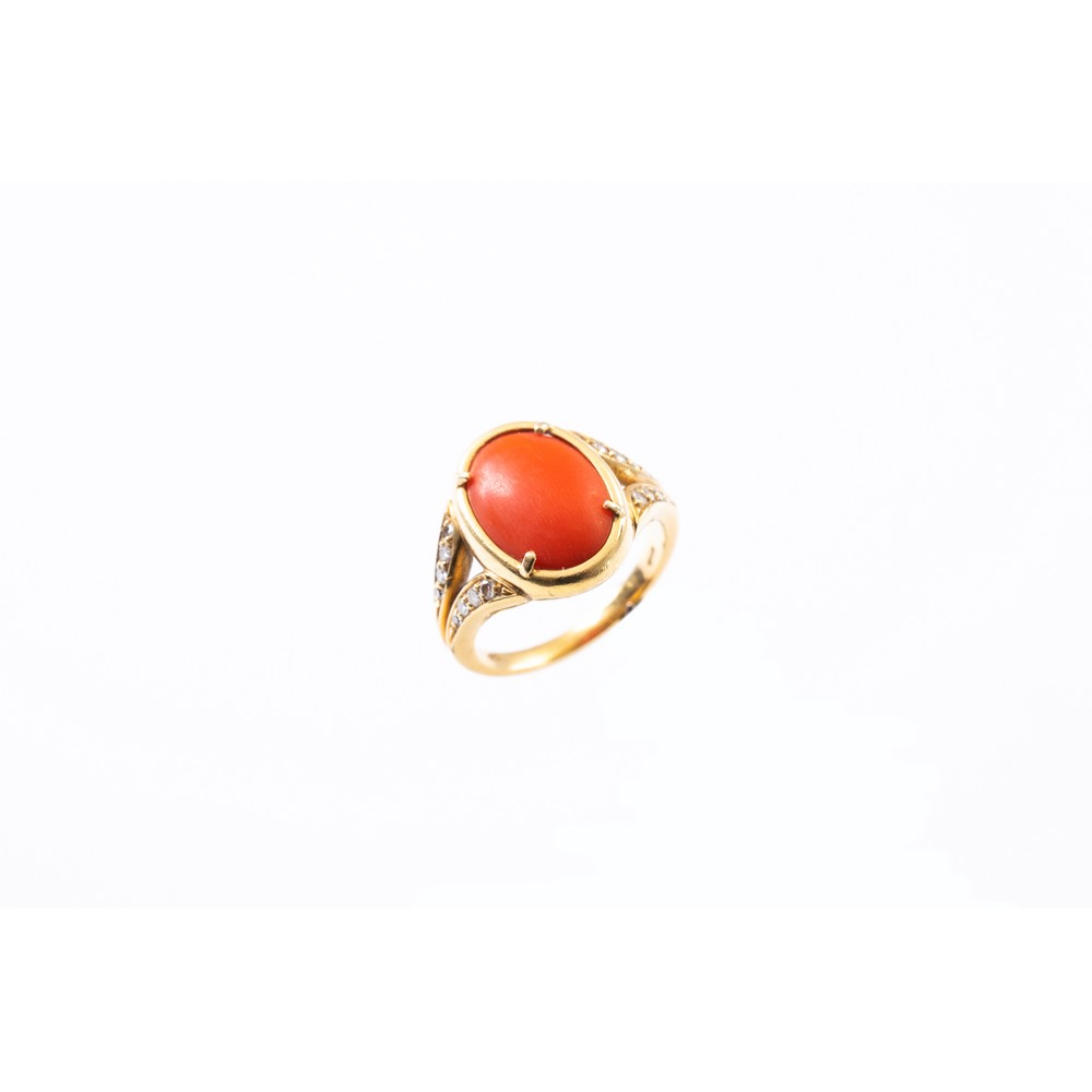 ANELLO in oro giallo 18 KT con diamanti e cabochon in corallo