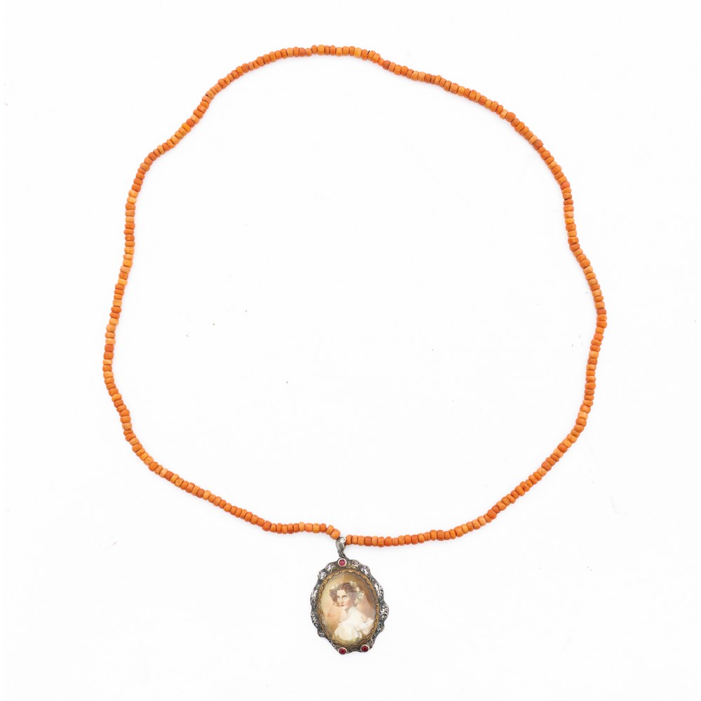 COLLANA in corallo di Sciacca taglio barilotto, pendente in metallo argentato con miniatura dipinta raffigurante "Mezzo busto femminile" e pietre di sintesi (g. 64,00).