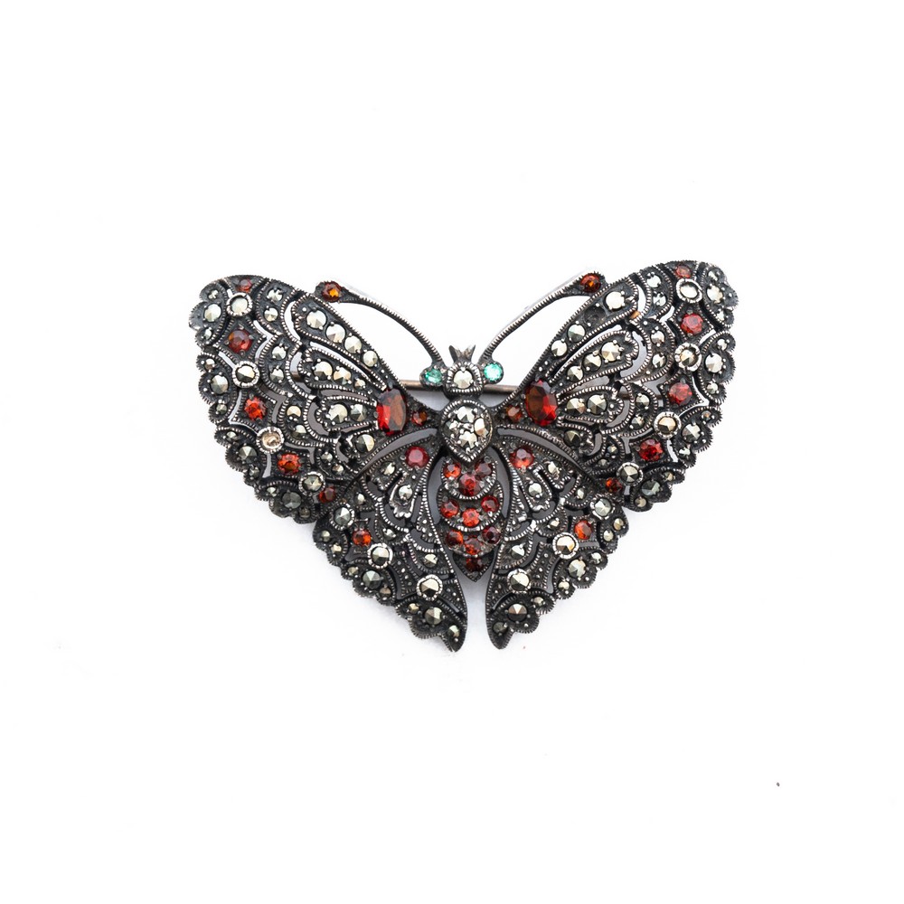 SPILLA in argento a foggia di farfalla con pietre di sintesi (g. 12,00) (due pietre mancanti).
