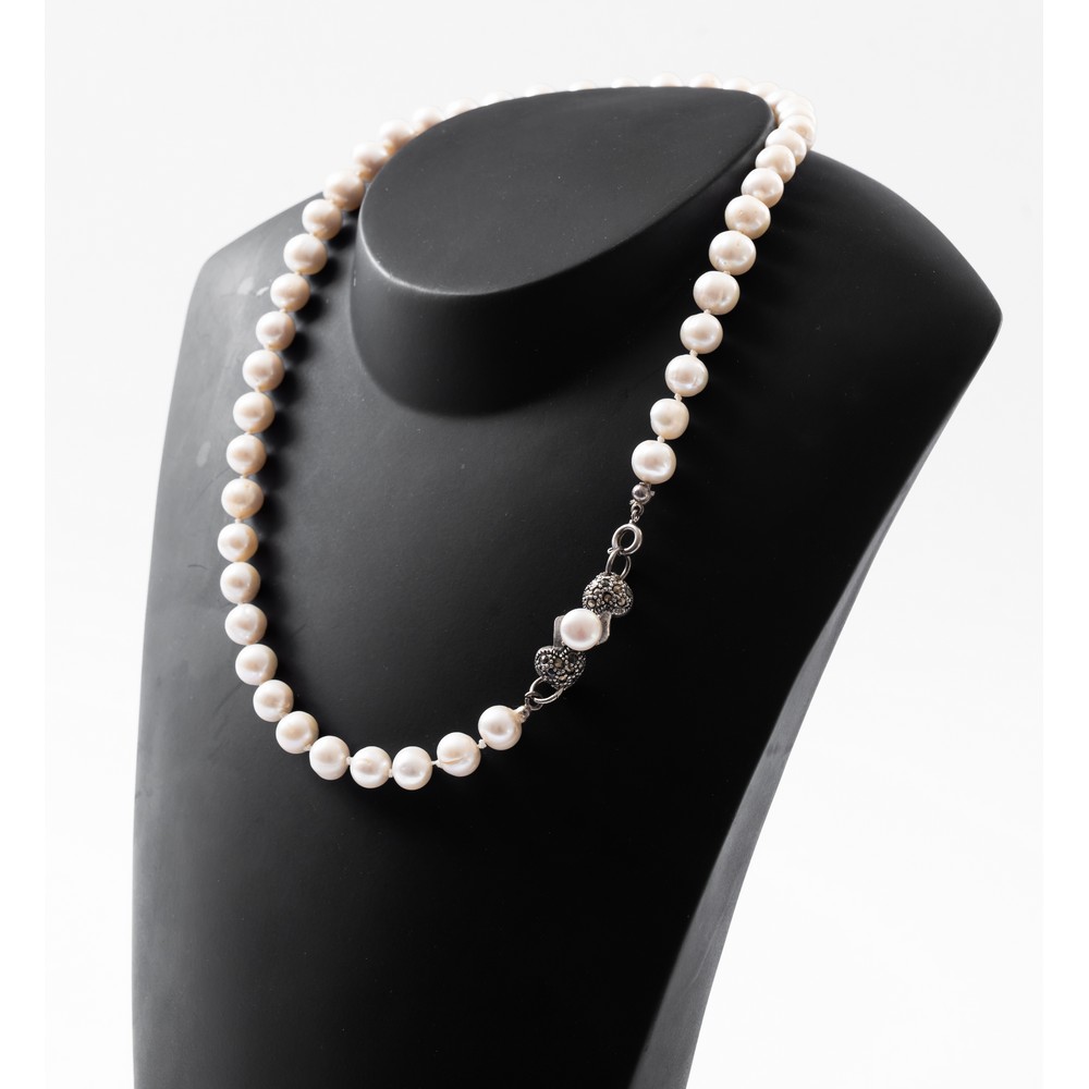 COLLANA di perle di fiume, susta in argento con marcasite (g. 51,25).