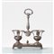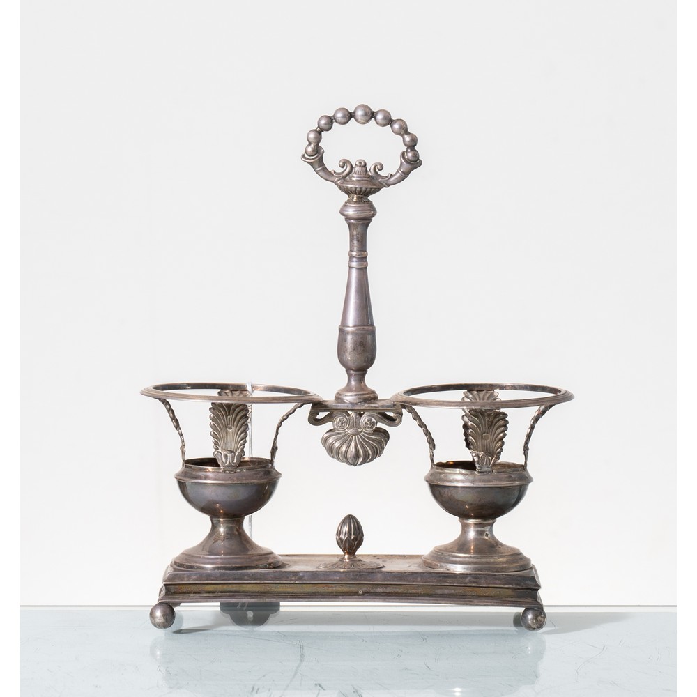 Oliera in argento 950, base rettangolare poggiante su quattro sfere con monogramma, portampolle sbalzate a motivo di palma, presa formata da sfere. Argentiere Etienne Auguste Courtois (g. 329).
