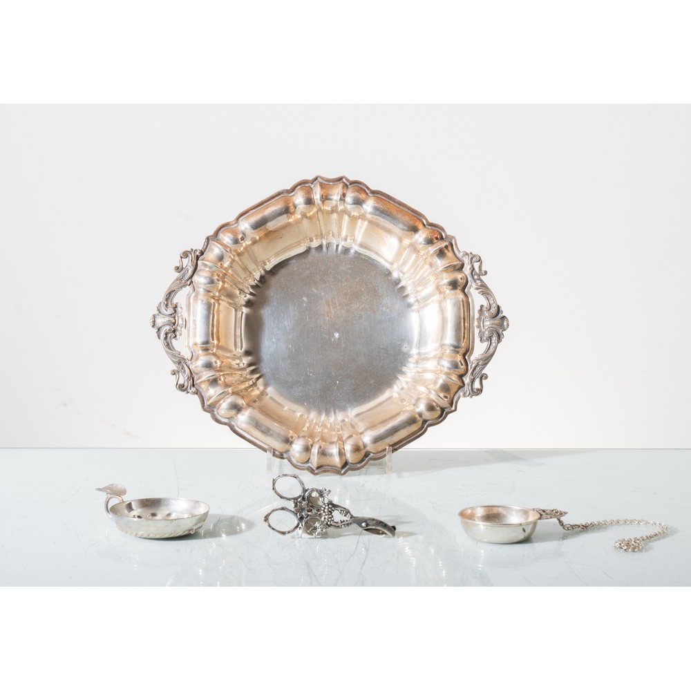 Centrotavola, forbici e due tastevin in argento sbalzato (g. 600).