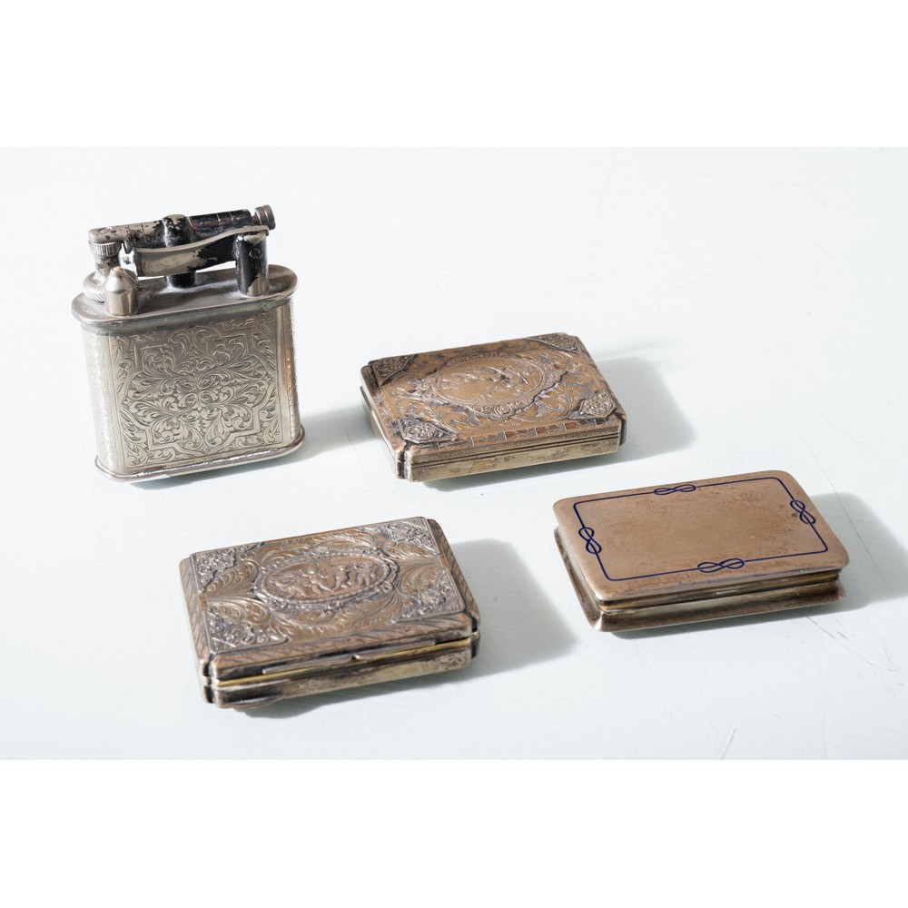 Due tabacchiere in argento sbalzato, interno in argento vermeil con incisione "Omaggio Moto Gilera", tabacchiera in argento e smalti blu ed un accendino
