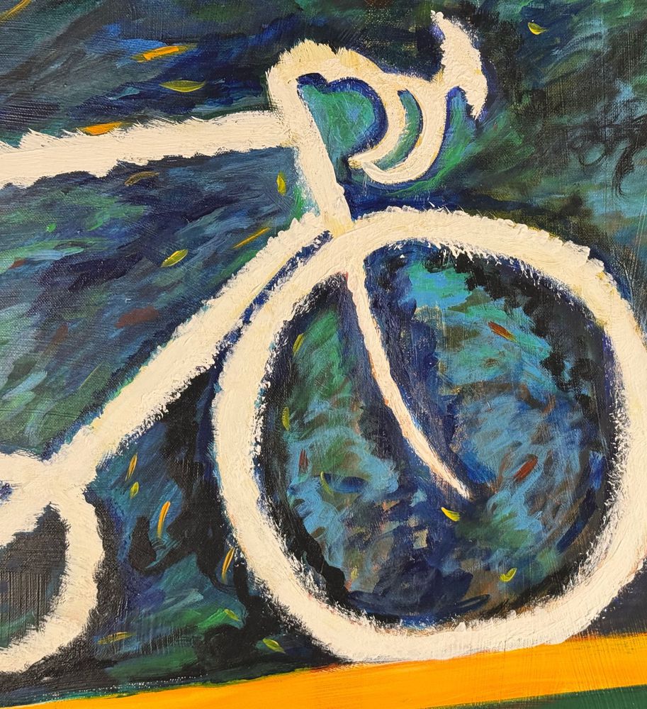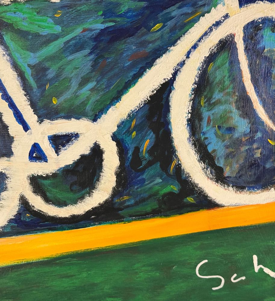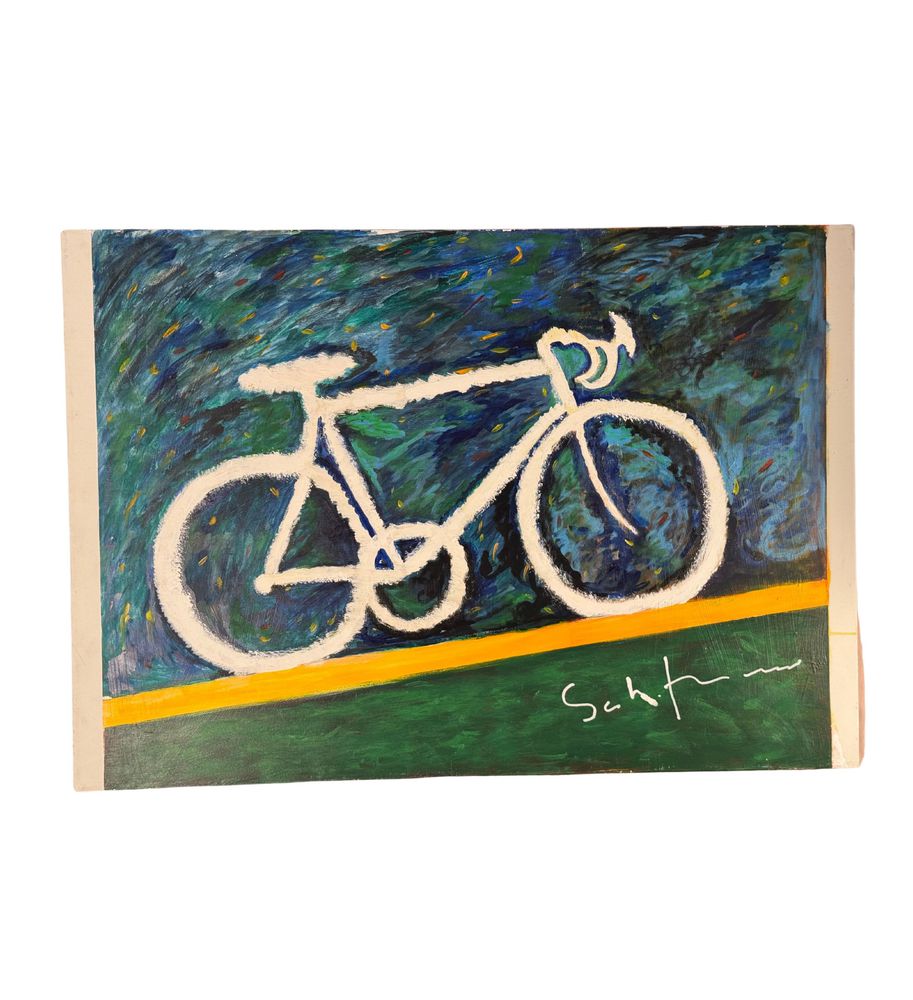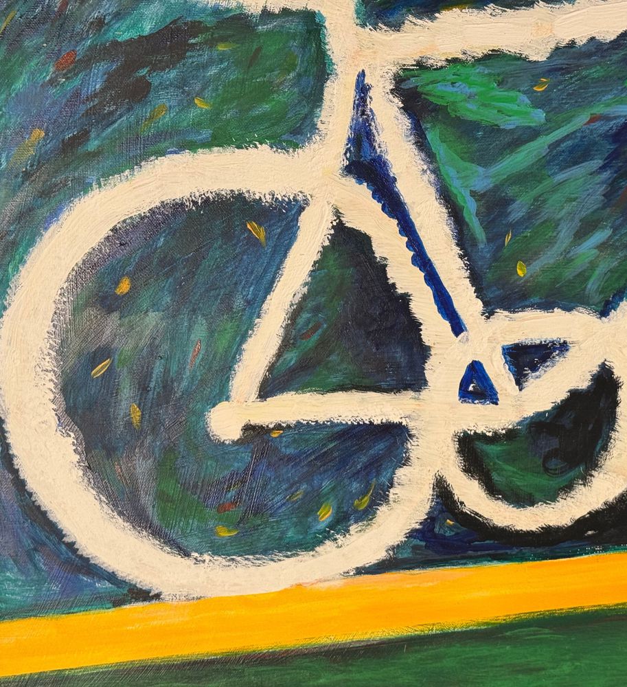 Dipinto olio su tela, omaggio a Mario Schifano periodo XX secolo scuola Italiana, raffigurante Bicicletta. Dimensioni: 100x70 cm. Da artista anonimo. Opera in buone condizioni.