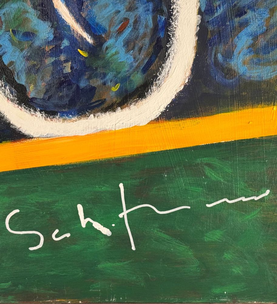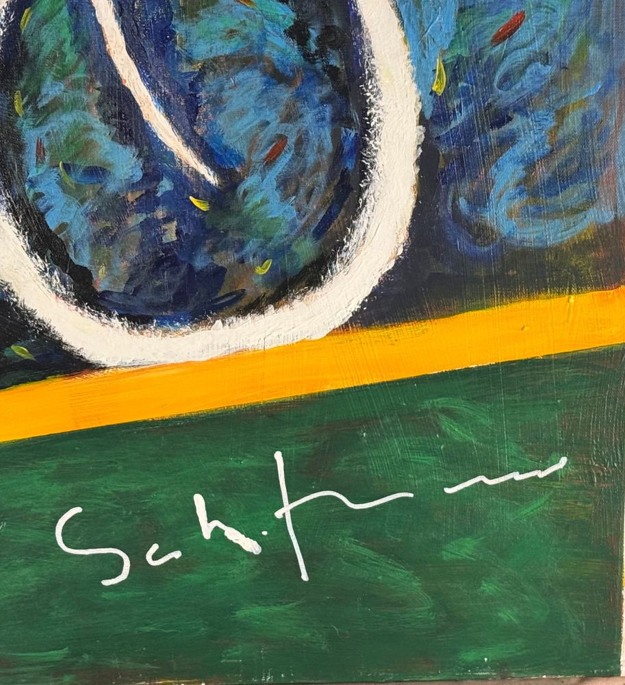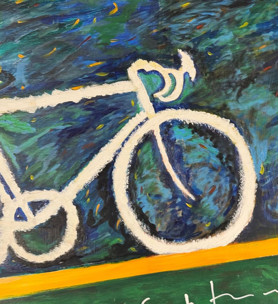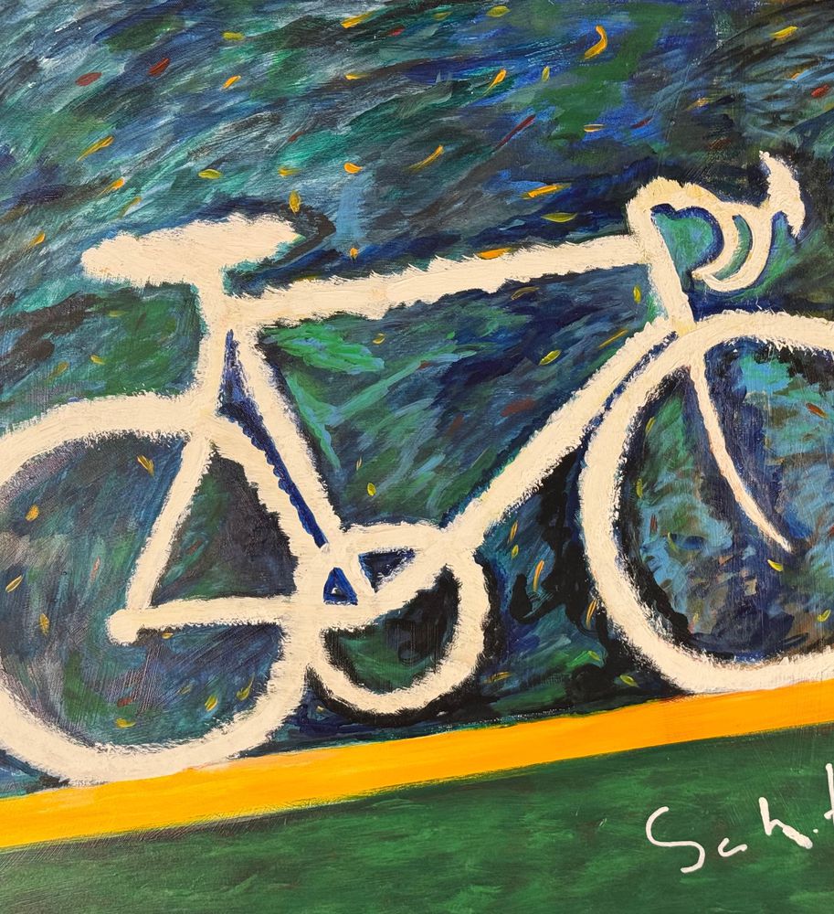 Dipinto olio su tela, omaggio a Mario Schifano periodo XX secolo scuola Italiana, raffigurante Bicicletta. Dimensioni: 100x70 cm. Da artista anonimo. Opera in buone condizioni.