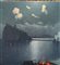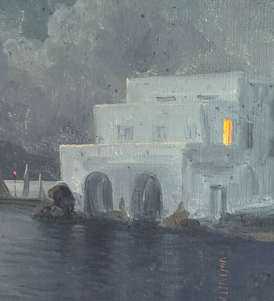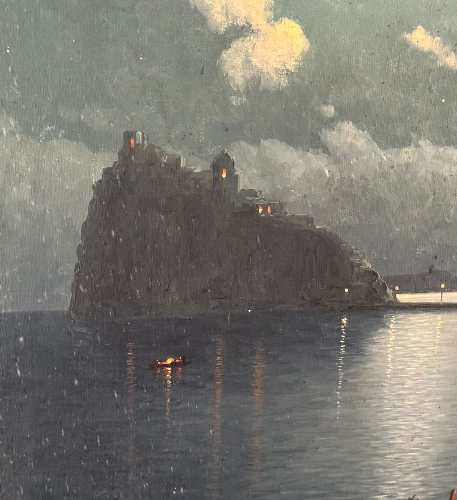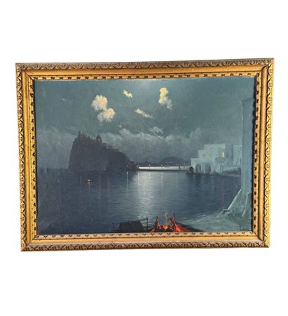 Dipinto olio su tela, periodo XX secolo scuola Italiana, raffigurante paesaggio al chiaro di luna del Castello Aragonese di Ischia (Località Ischia Ponte). Dimensioni compreso cornice: 80x60 cm. Dimensioni interno cornice: 70x50 cm. Firmato in basso a destra da artista non identificato. Opera in buone condizioni con lievi segni di vissuto come da foto allegate.