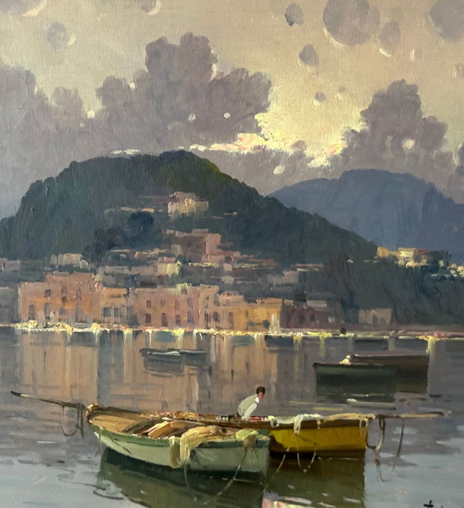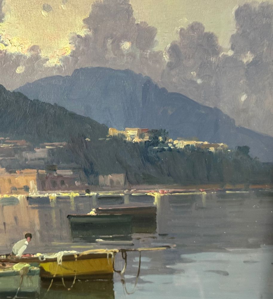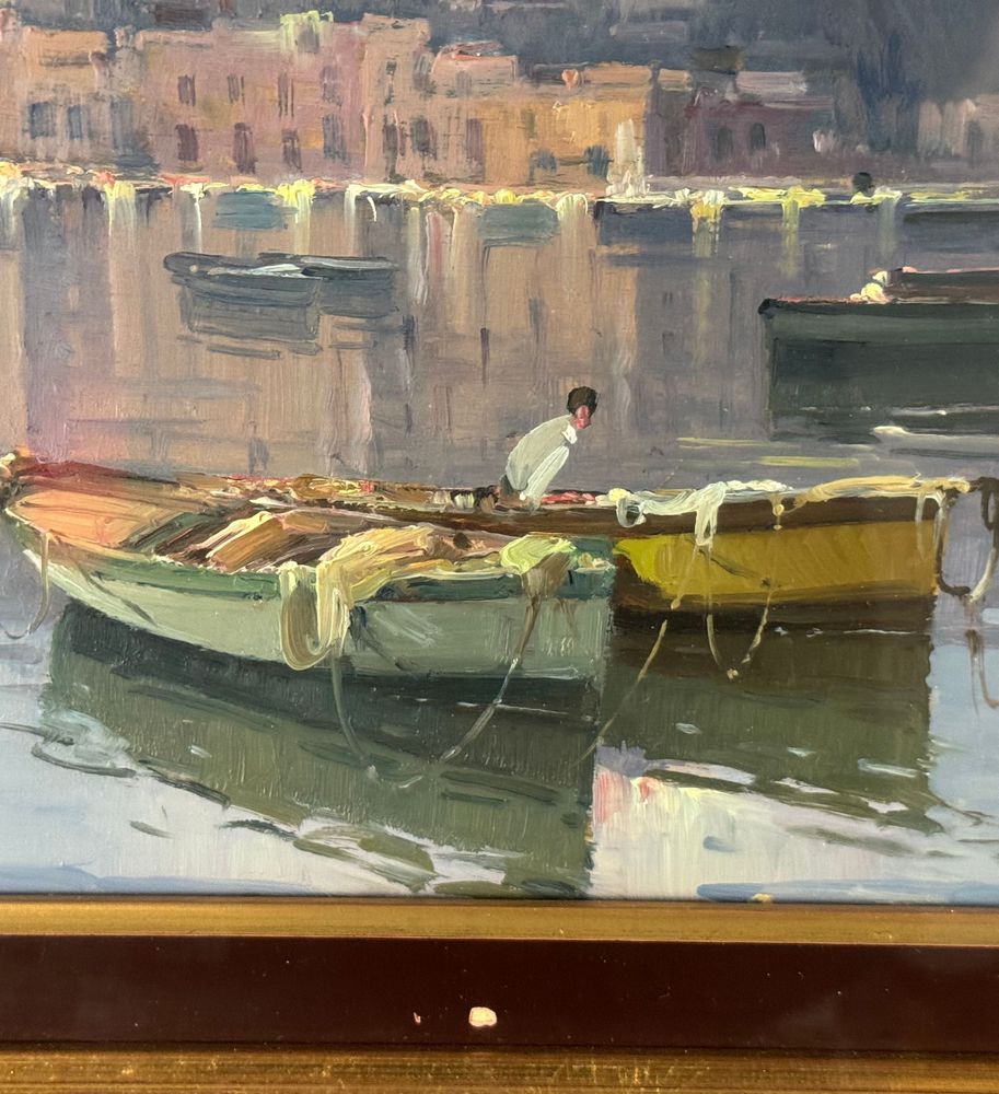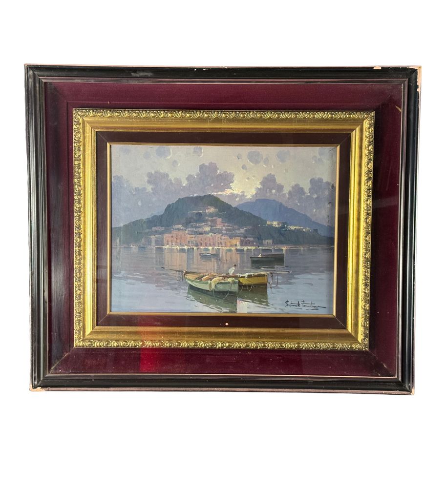 Dipinto olio su tavola, periodo XX secolo scuola italiana raffigurante Marina con barche. Dimensioni compreso cornice: 65x55 cm. Dimensioni interno cornice: 30x40 cm. Firmato in basso a destra Fortunato Fontana. Opera in buone condizioni.