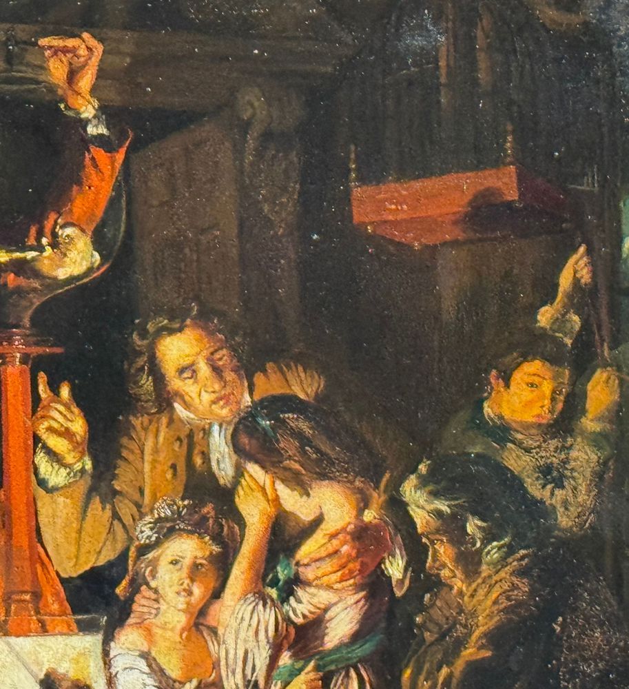 Dipinto olio su tavola, periodo XIX/XX secolo scuola Europea, raffigurante Scena di interno con personaggi. Dimensioni compreso cornice: 40x50 cm. Dimensioni interno cornice: 30x40 cm. Traccia di firma in basso a sinistra. Opera in buone condizioni con lievi segni di vissuto come da foto allegate.