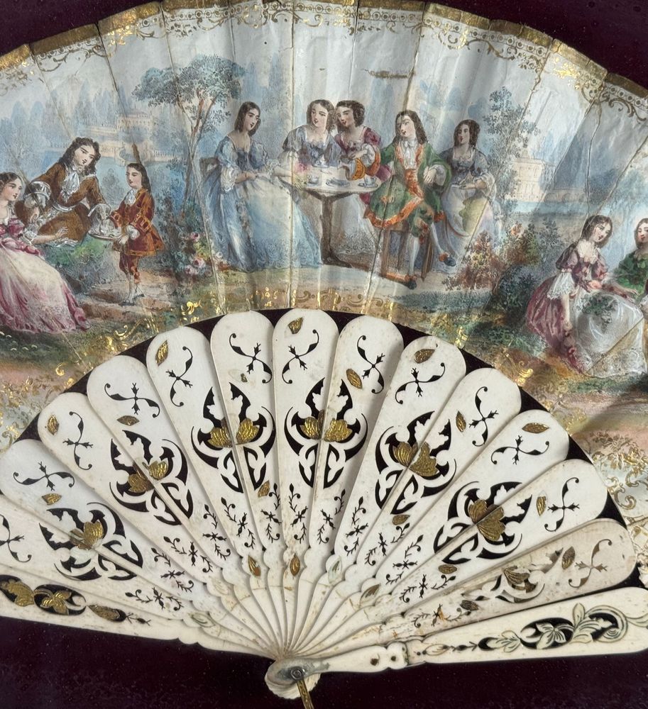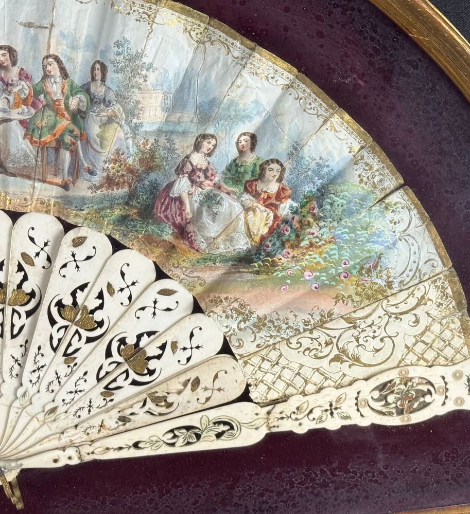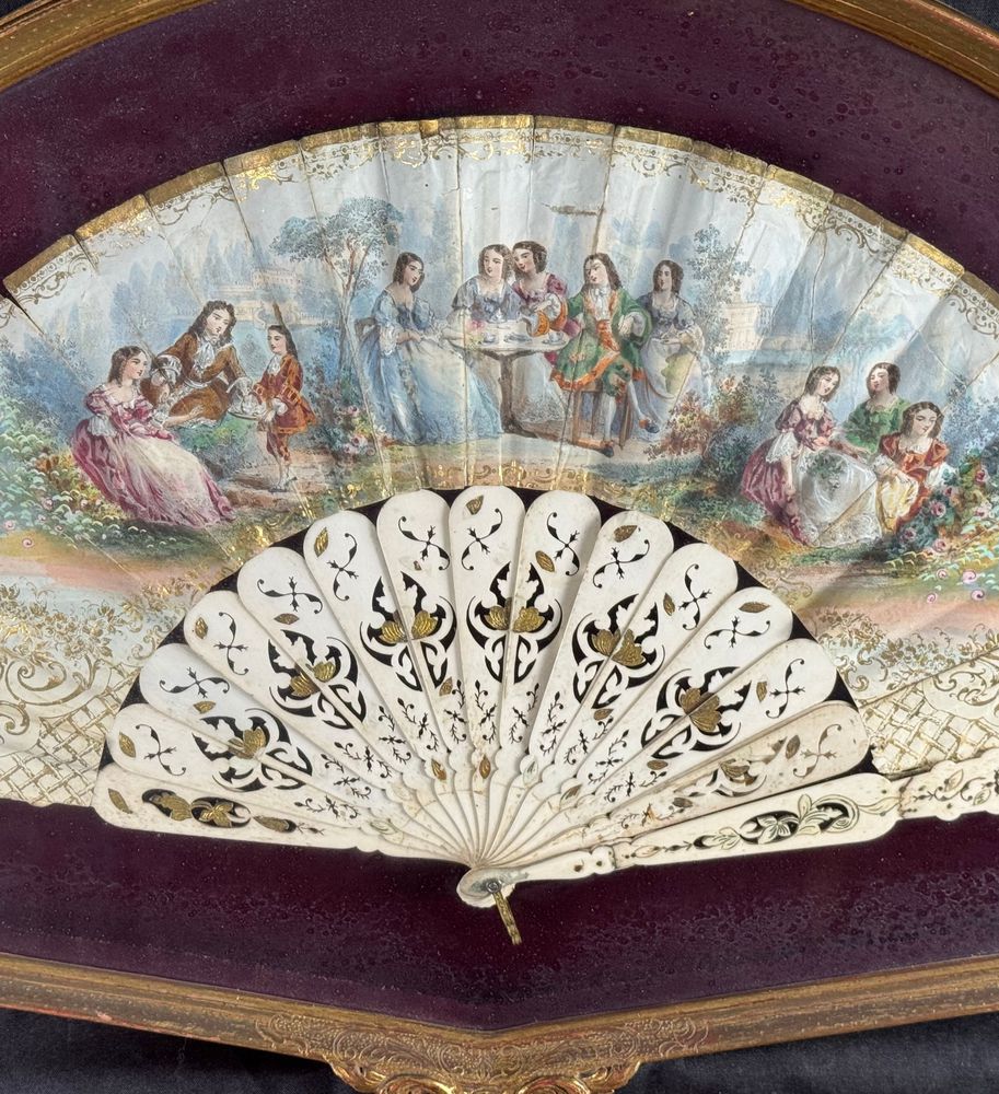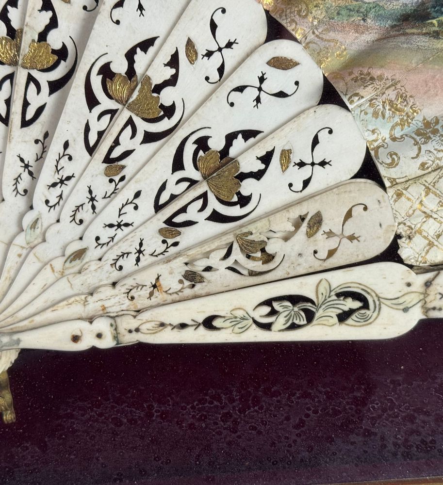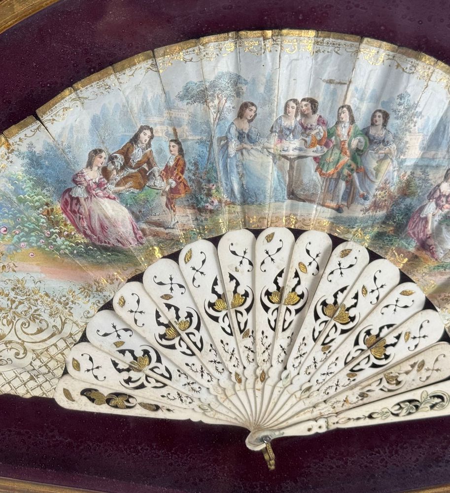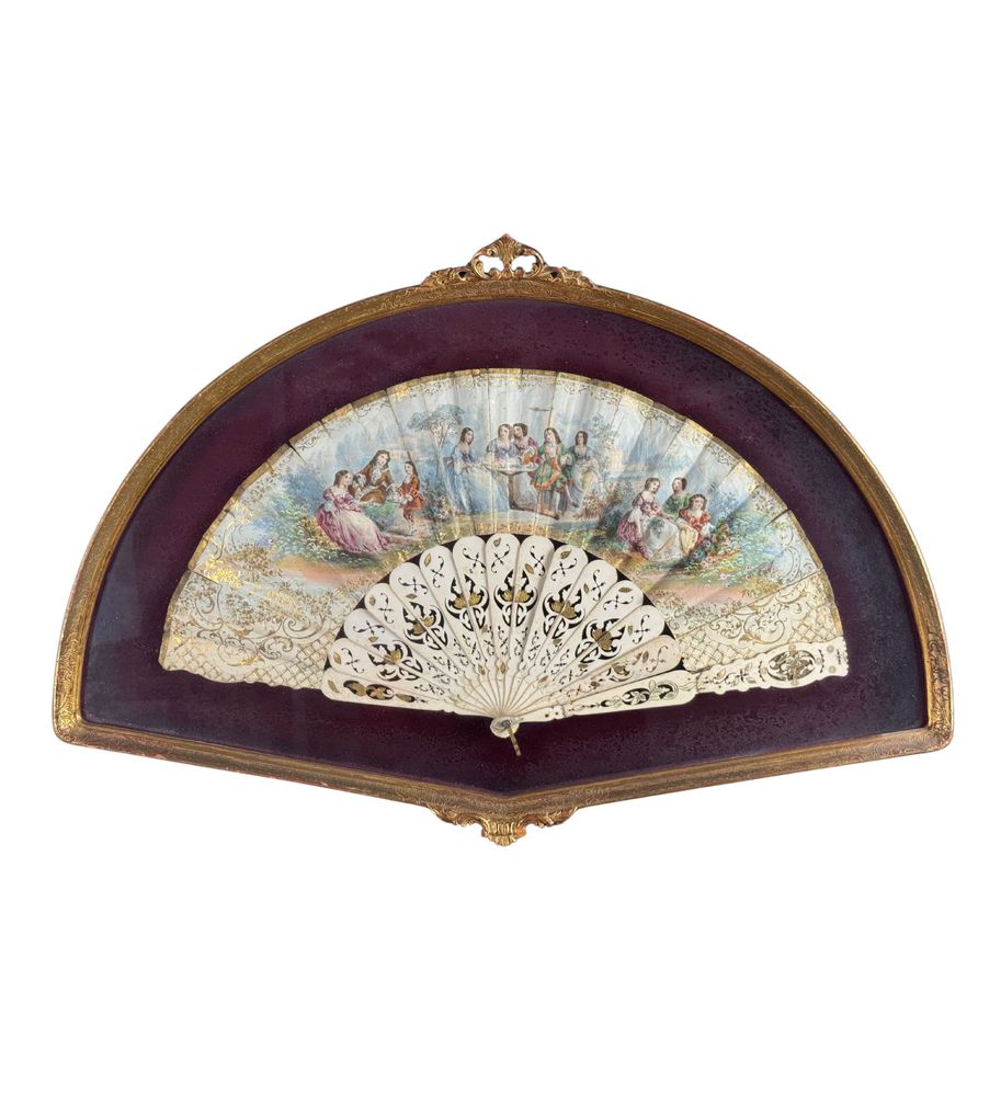 Ventaglio a figure neoclassiche in bacheca. Dimensioni compreso cornice:...