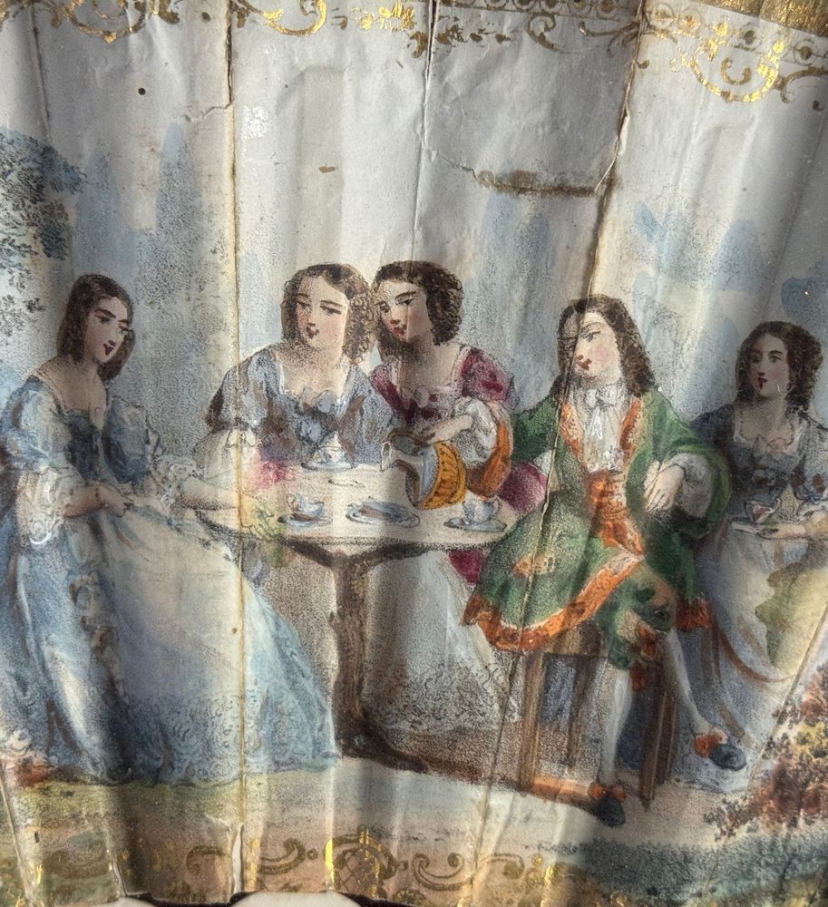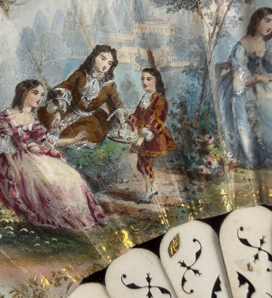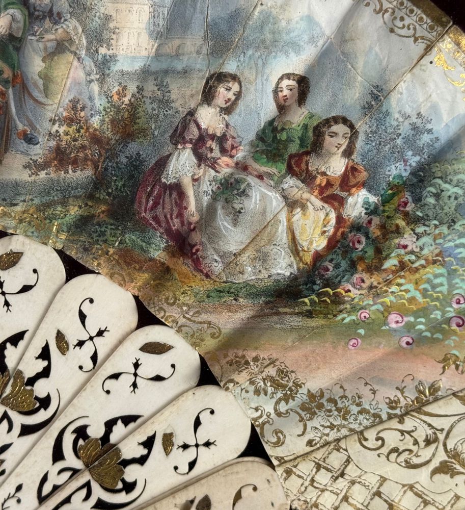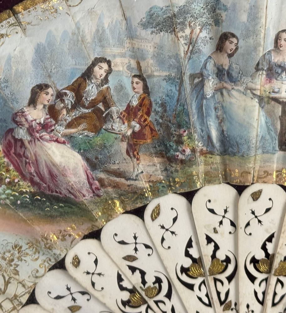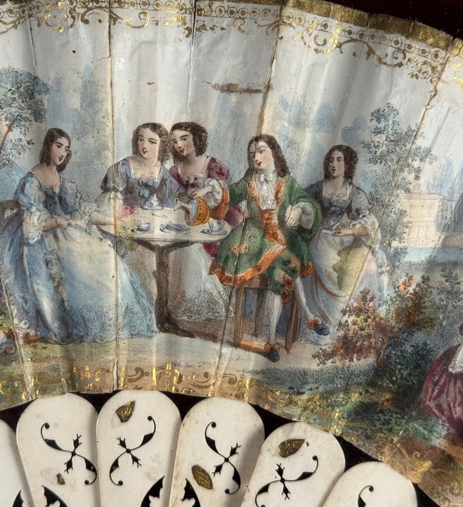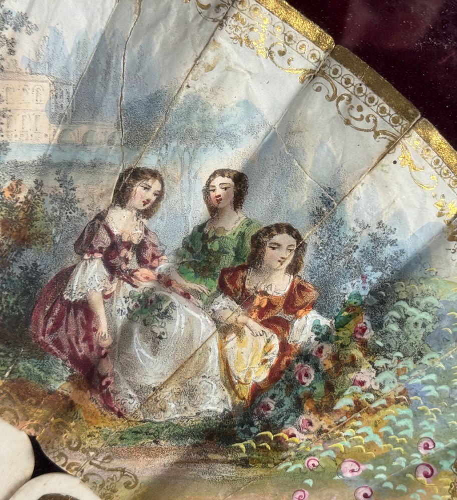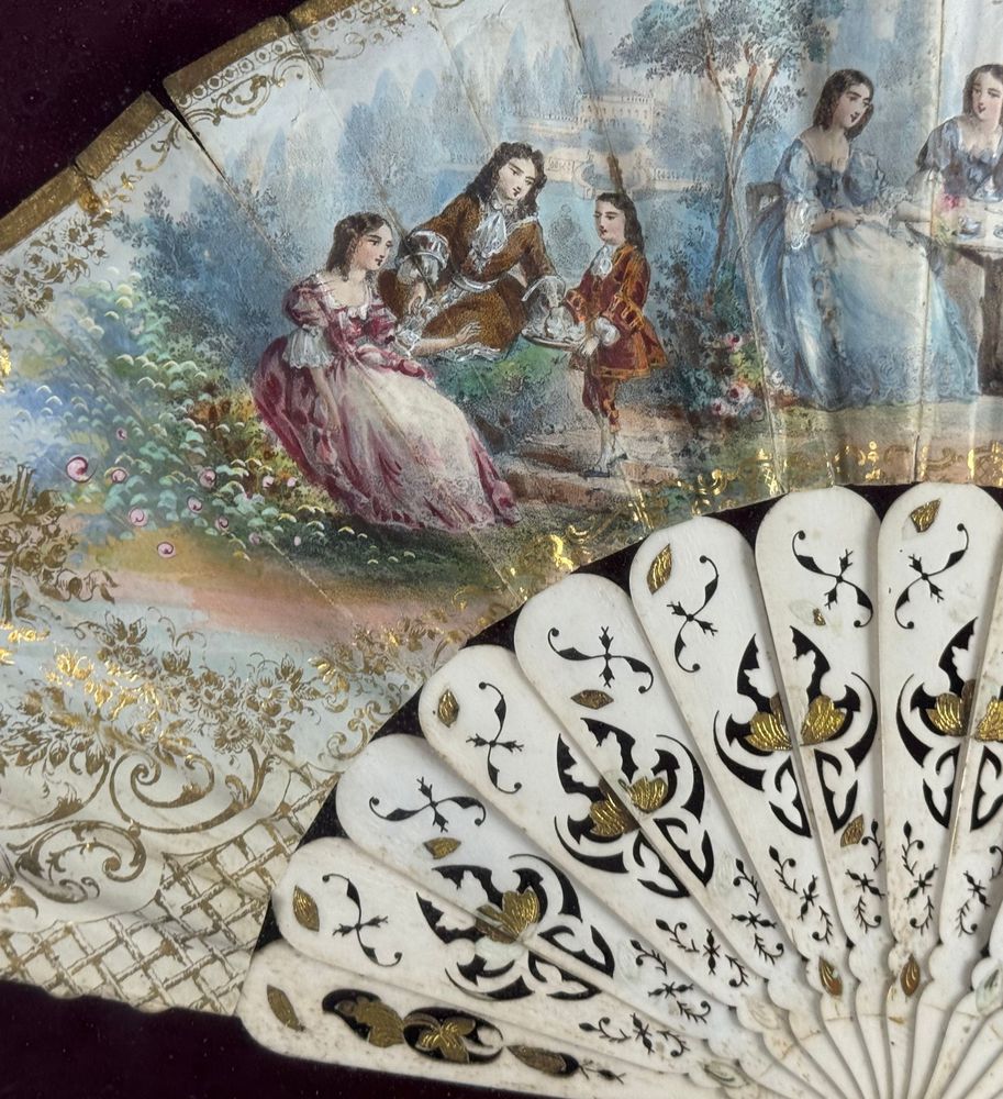 Ventaglio a figure neoclassiche in bacheca. Dimensioni compreso cornice:...