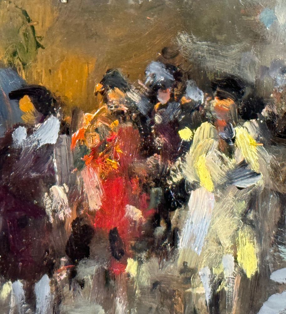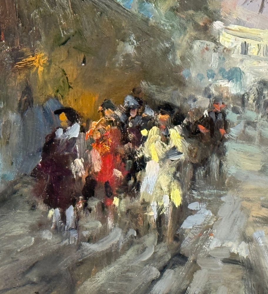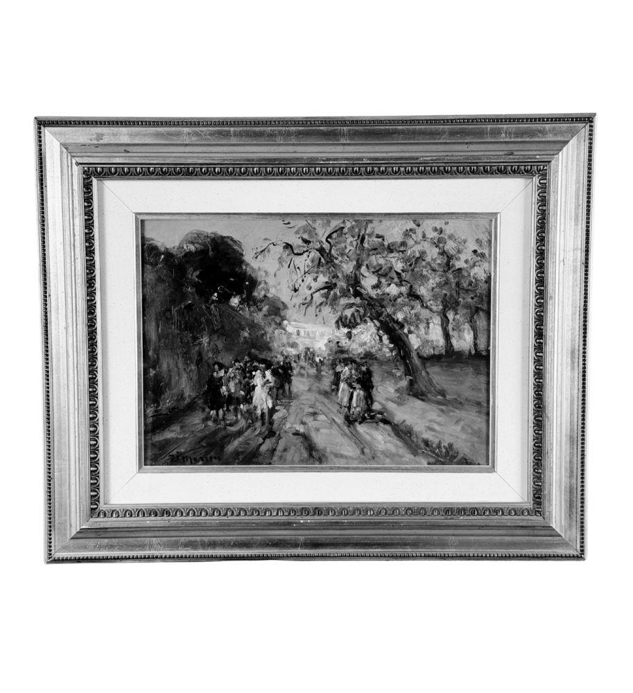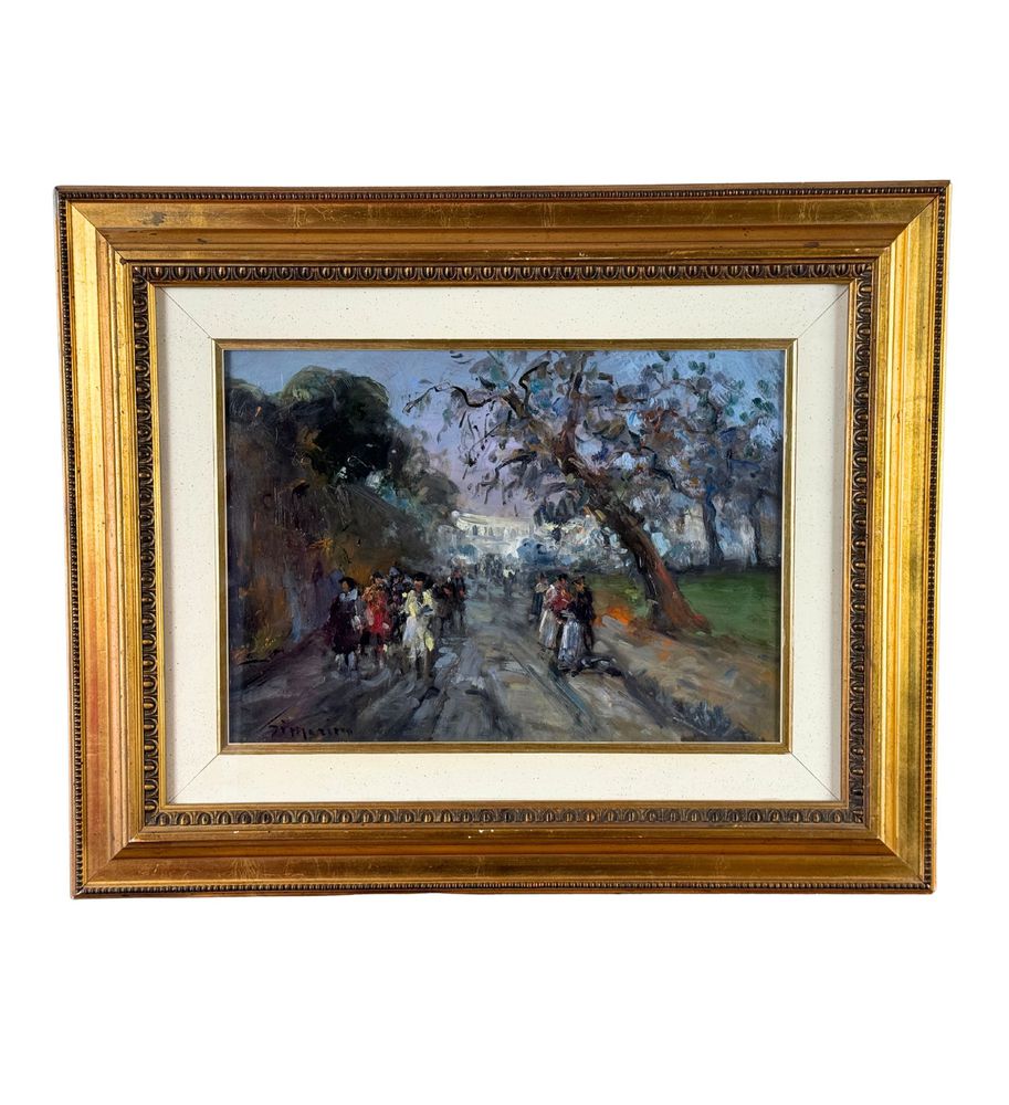 Dipinto olio su tavola, periodo XX secolo scuola Italiana, raffigurante Strada con personaggi. Dimensioni compreso cornice: 54x44 cm. Dimensioni interno cornice: 35x25 cm. Reca firma in basso a sinistra Di Marino. Opera in ottime condizioni.