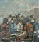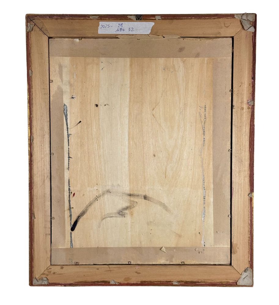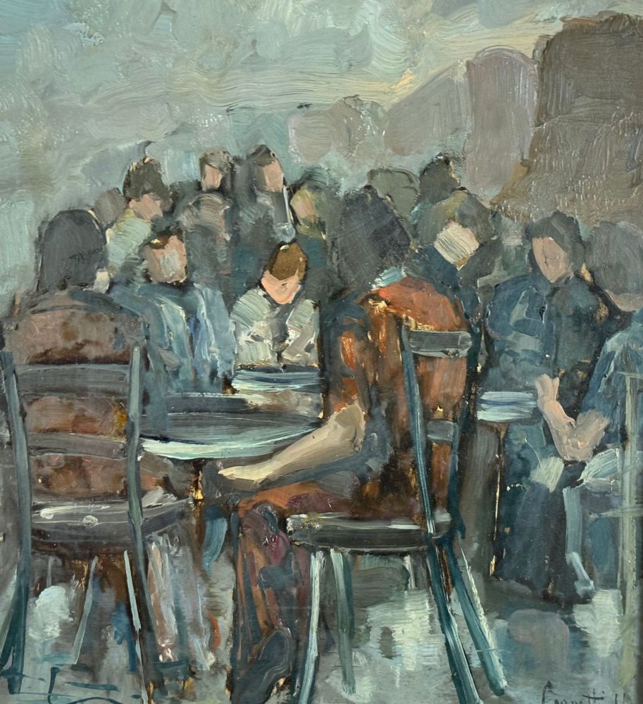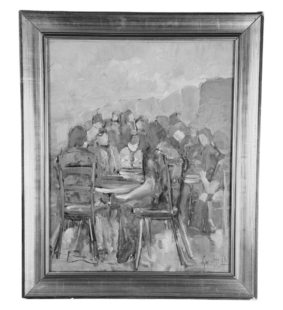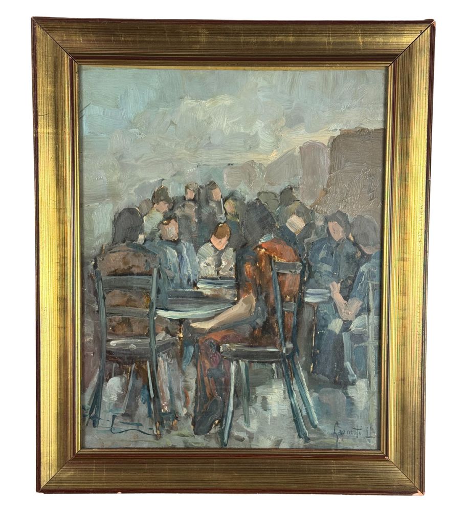 Dipinto olio su tavola, periodo XX secolo scuola Italiana, raffigurante Personaggi al tavolo. Dimensioni compreso cornice: 50x60 cm. Dimensioni interno cornice: 40x50 cm. Reca firma in basso a destra artista non identificato. Opera in buone condizioni.