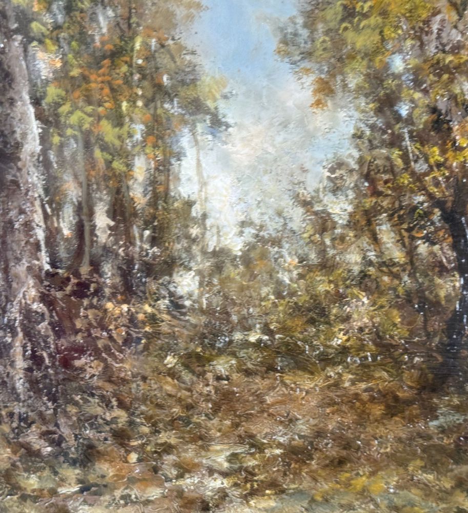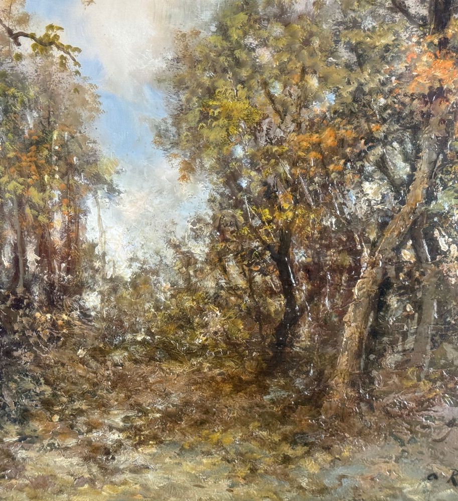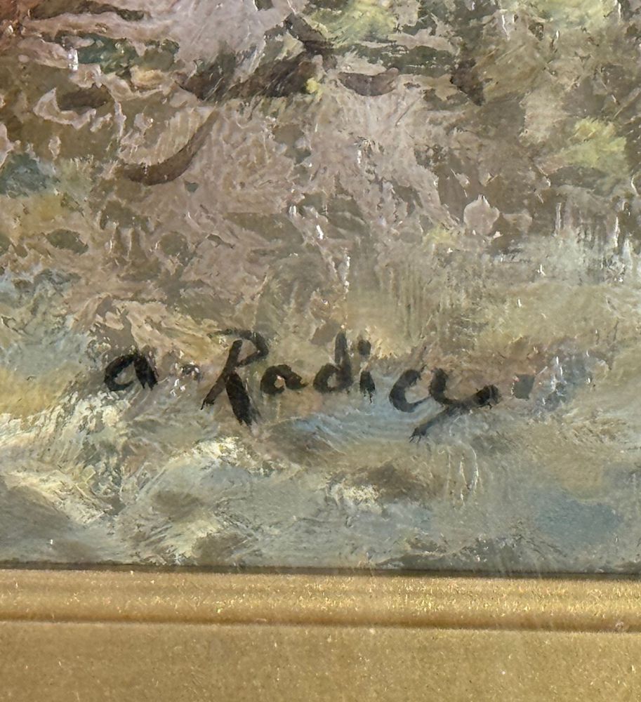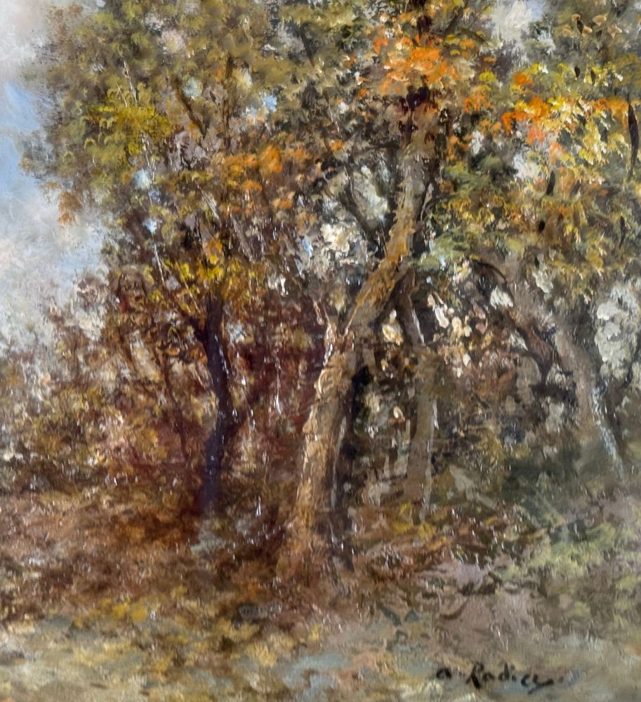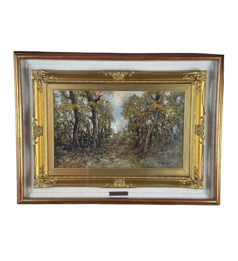 Dipinto olio su tavola, periodo XX secolo scuola Italiana, raffigurante Paesaggio boschivo. Dimensioni compreso cornice: 58x78 cm. Dimensioni interno cornice: 30x50 cm. Reca firma in basso a destra Augusto Radice. Opera in buone condizioni.