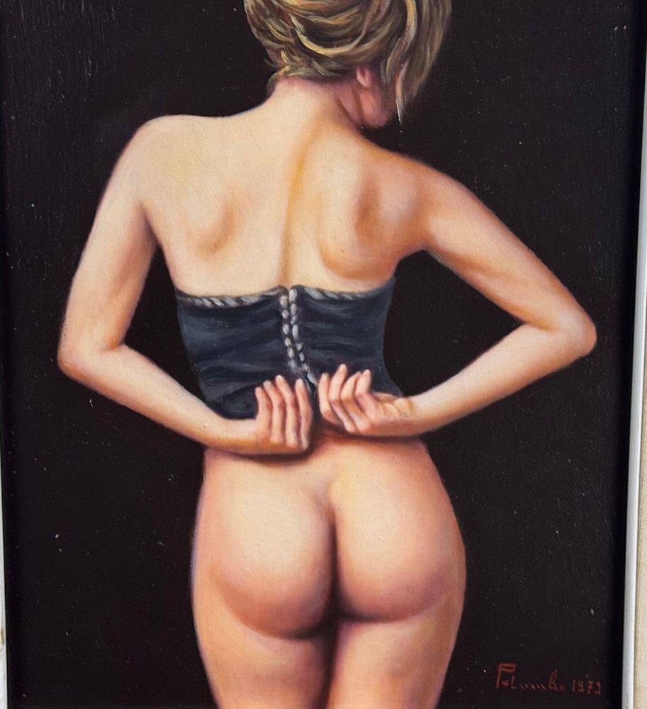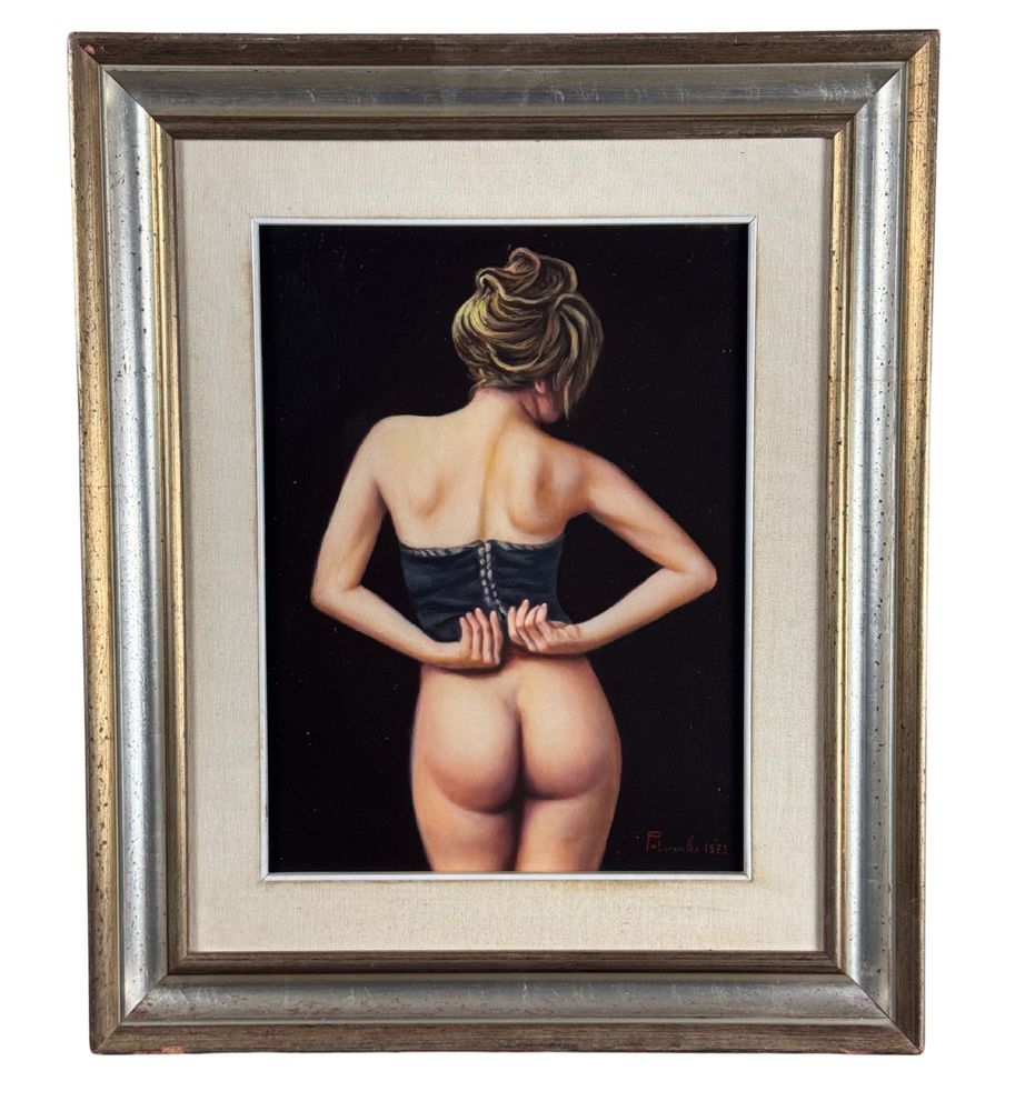 Dipinto olio su tela, periodo XX secolo, scuola Italiana, raffigurante Nudo di donna di spalle. Dimensioni compreso cornice: 50x60 cm. Dimensioni interno cornice: 30x40 cm. Reca firma in basso a destra e autentica sul retro artista non identificato. Opera in buone condizioni.