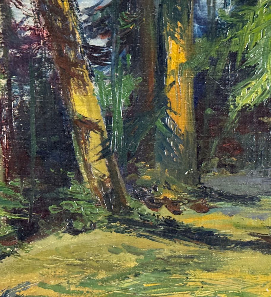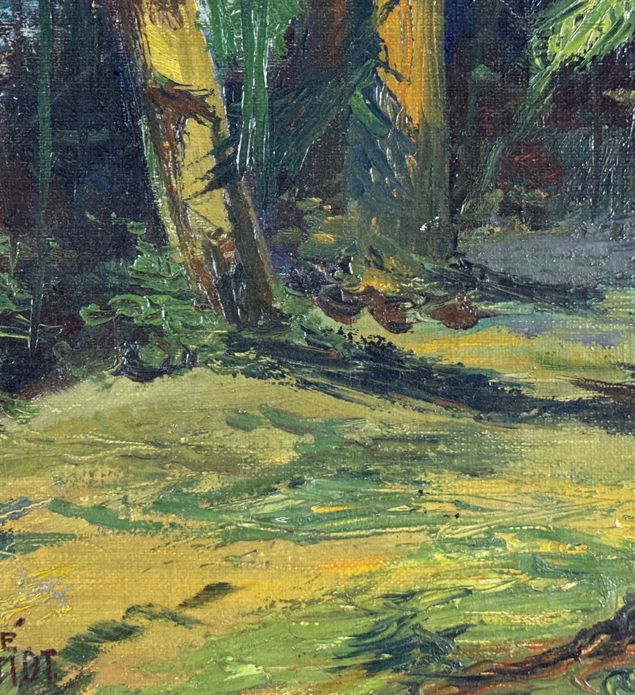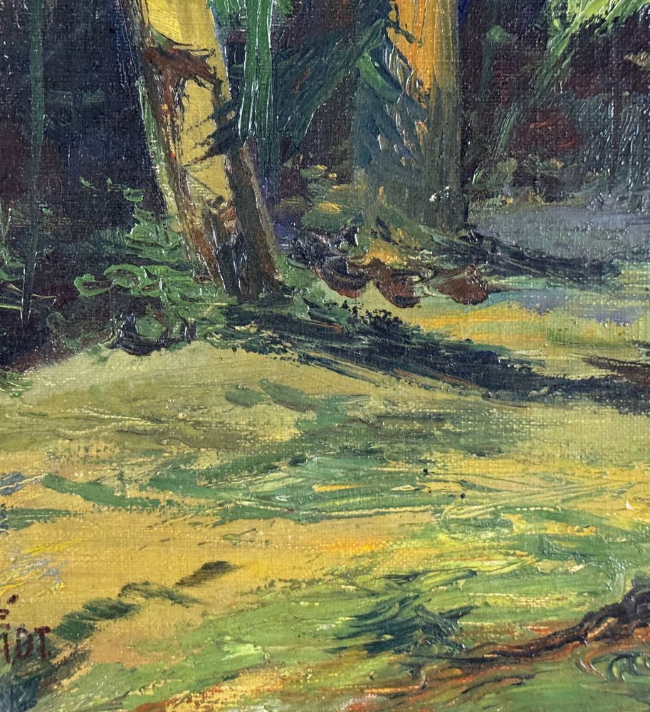 Dipinto olio su tela, periodo XX secolo scuola Europea, raffigurante Paesaggio alberato. Dimensioni compreso cornice: 39x55 cm. Dimensioni interno cornice: 33x49 cm. Reca firma in basso a destra da artista non identificato. Opera in buone condizioni.