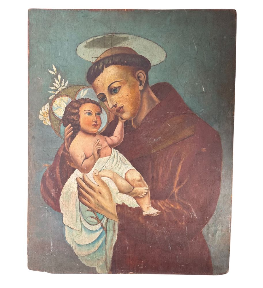 Dipinto olio su tavola, periodo XIX secolo scuola Italiana, raffigurante Sant'Antonio. Dimensioni: 60x46 cm. Opera in buone condizioni con lievi segni di vissuto come da foto allegate.