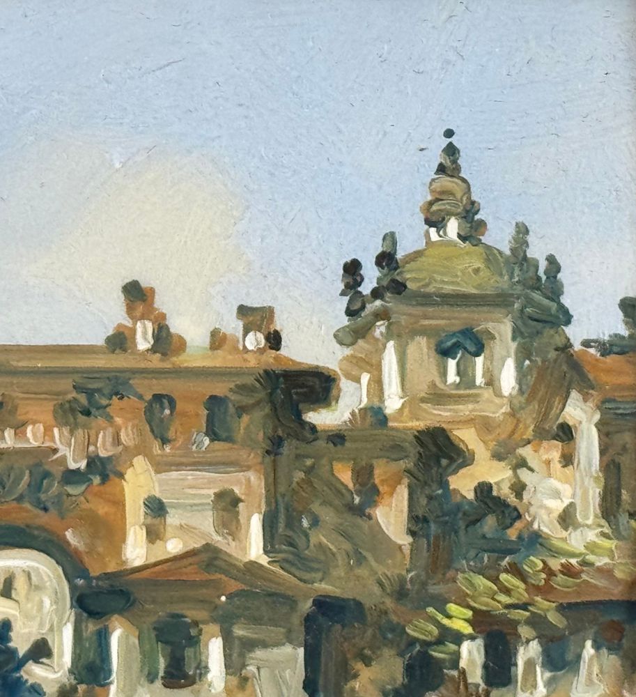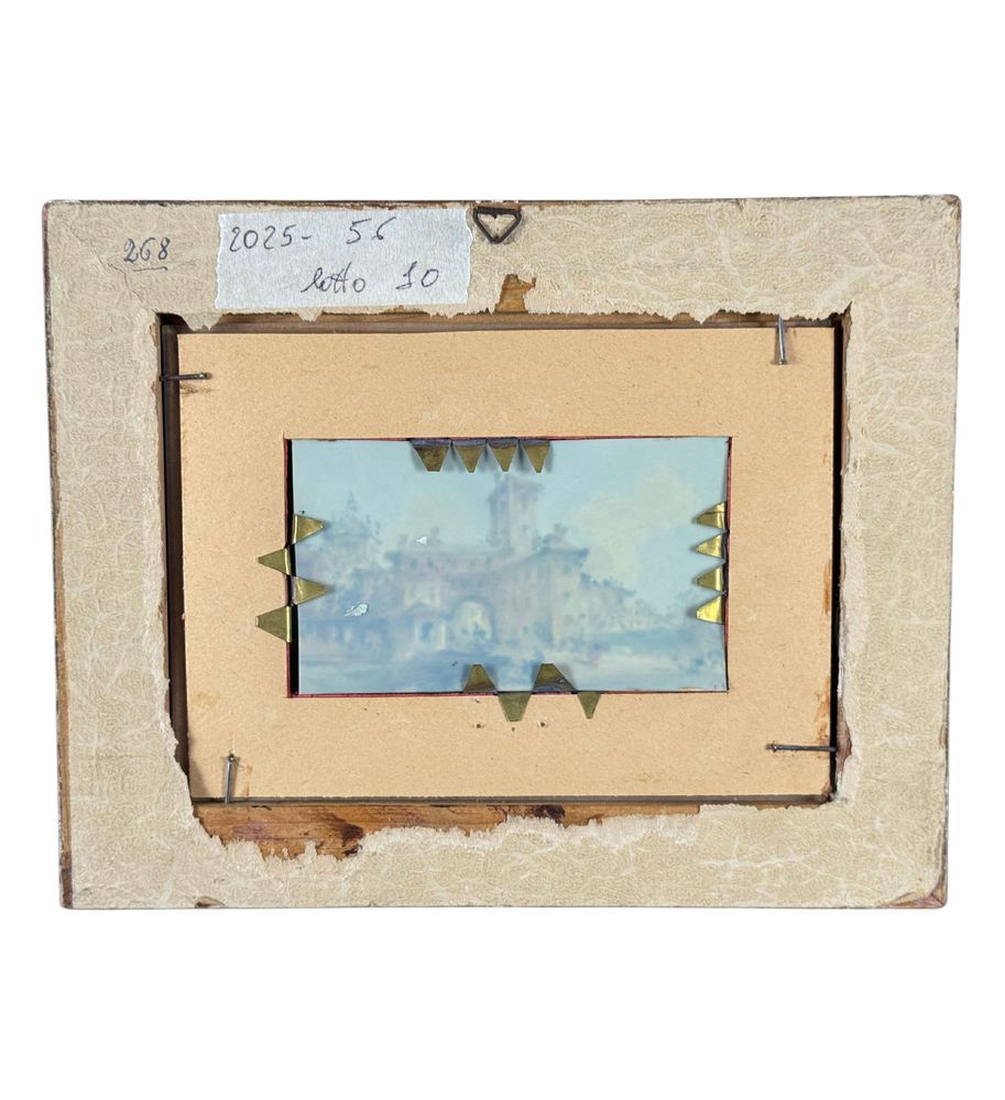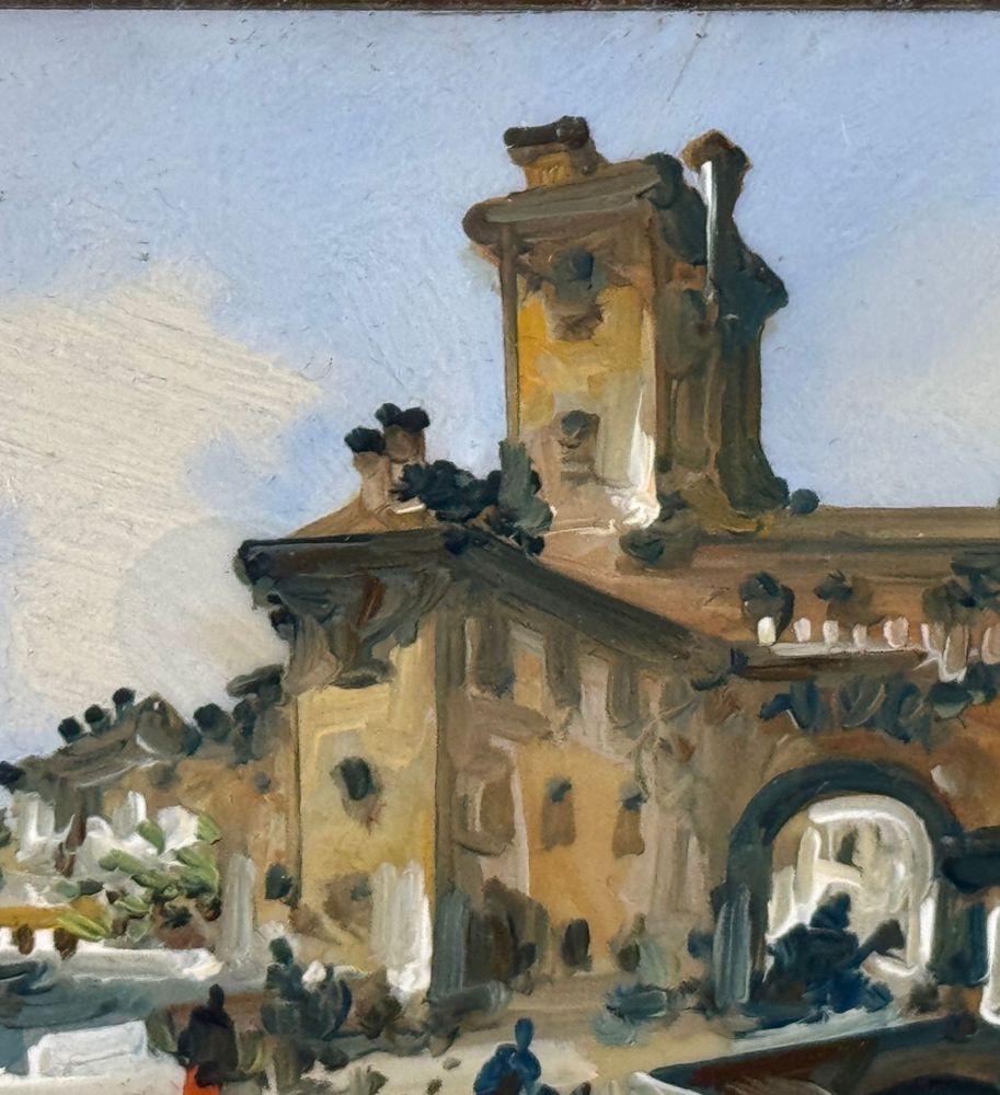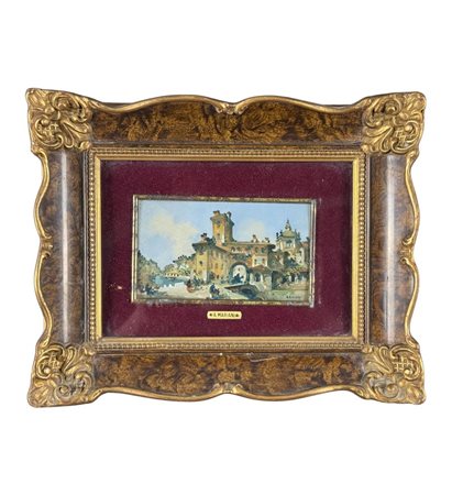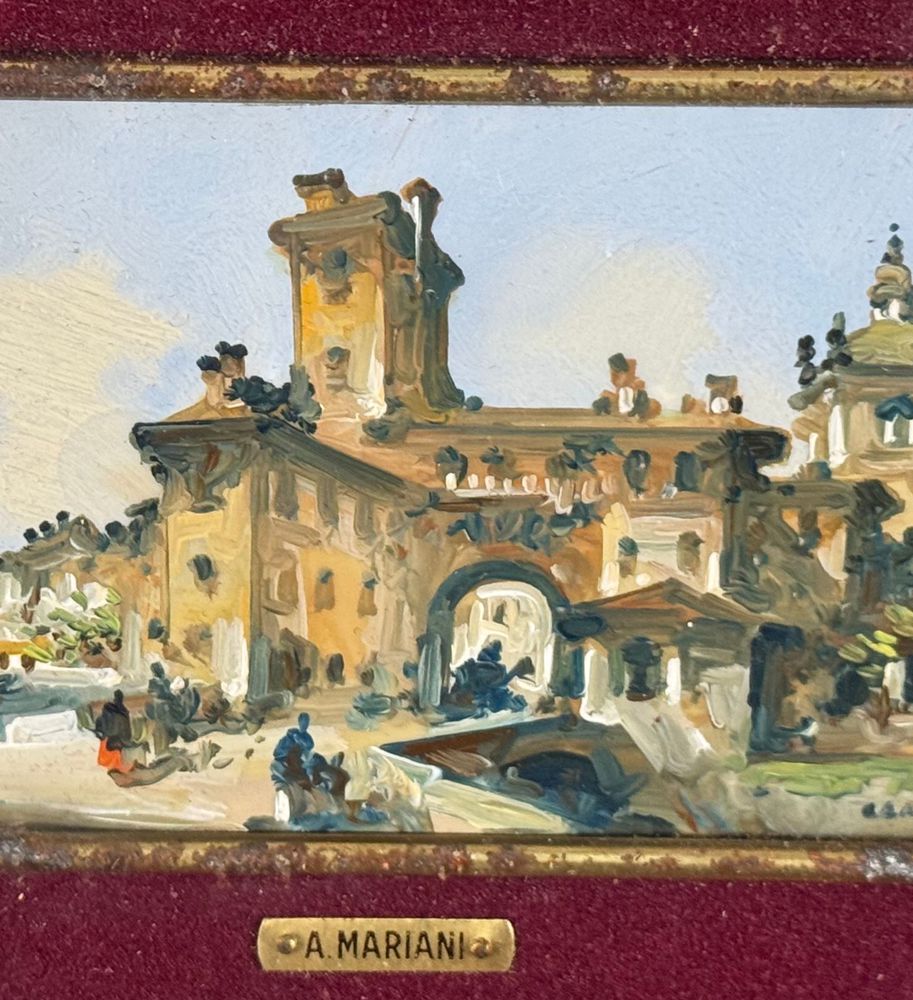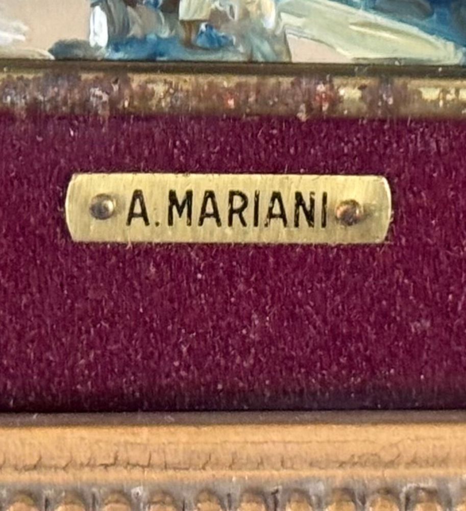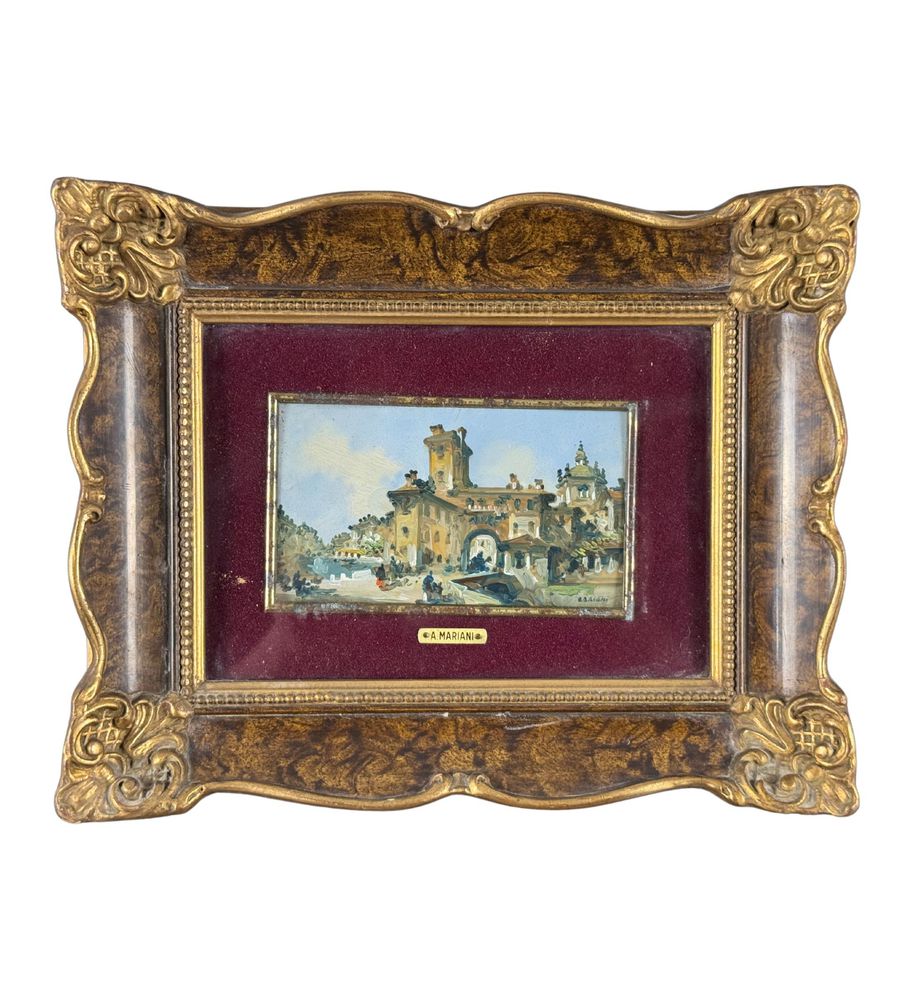 Dipinto olio su placca, periodo XX secolo, scuola Italiana, raffigurante Paesaggio con personaggi. Dimensioni compreso cornice: 25x20 cm. Dimensioni interno cornice: 12x7 cm. Firmato in basso a destra A. Mariani. Opera in buone condizioni.