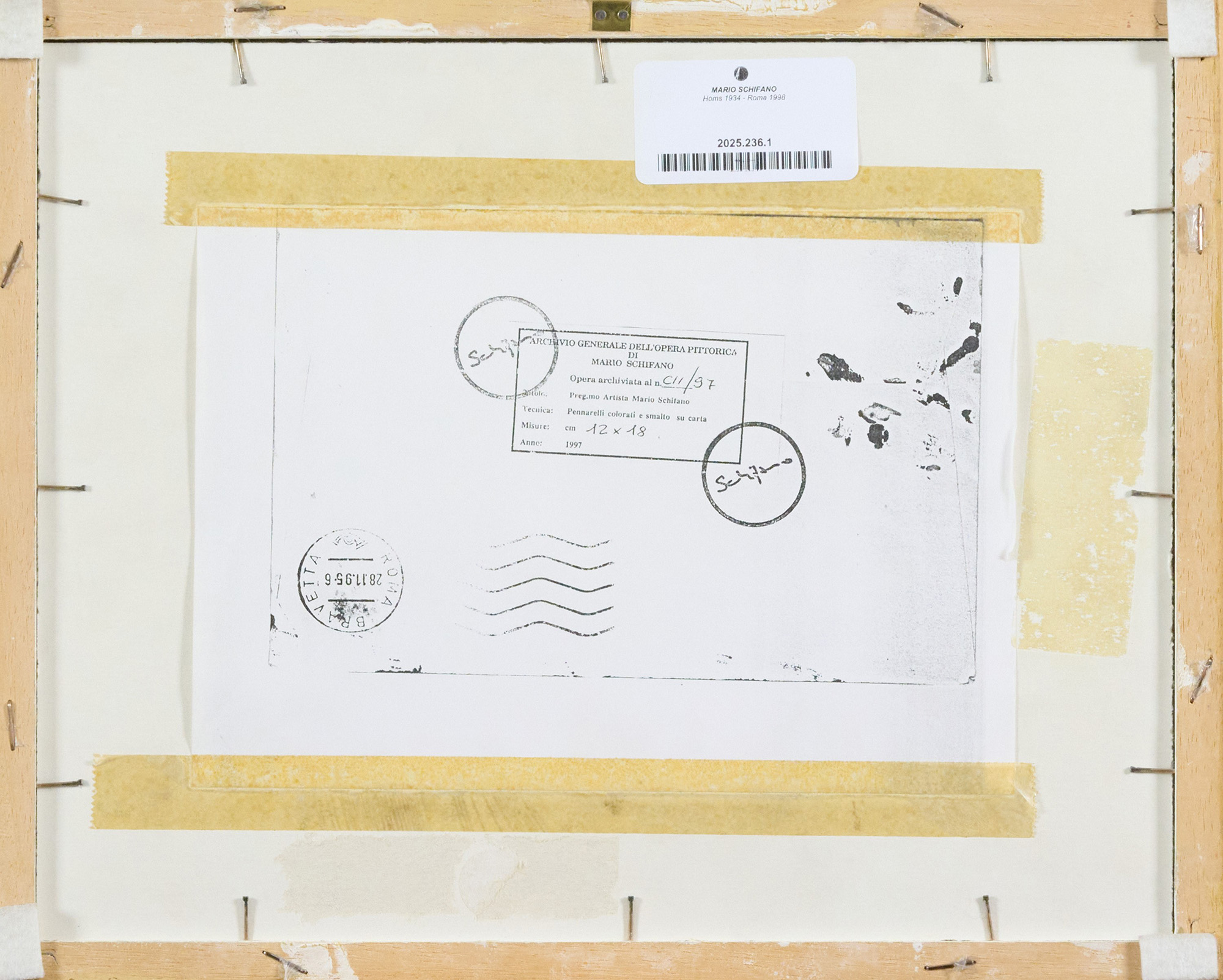 Sul verso: etichetta dell'"Archivio Generale dell'opera pittoria di Mario Schifano", con descrizione ed archivio n°C11/97.