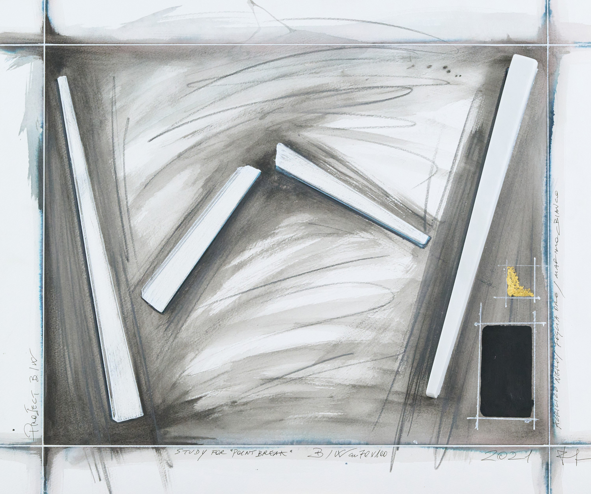Tecnica mista, marmo bianco e foglio oro su carta intelata