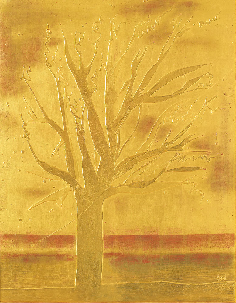 oro zecchino su tavola cm. 98x77, firma in basso a destra, dichiarazione d'autenticità dell'artista su foto.