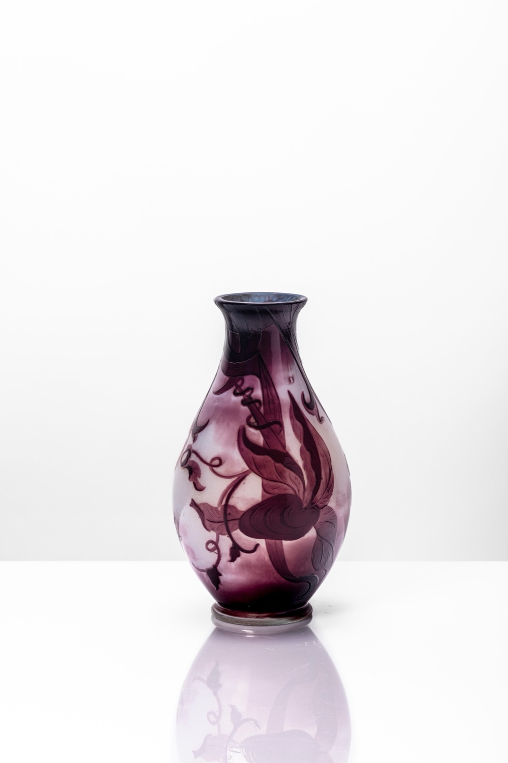 Vaso piriforme inciso ad acido doppio strato con decoro orchidee