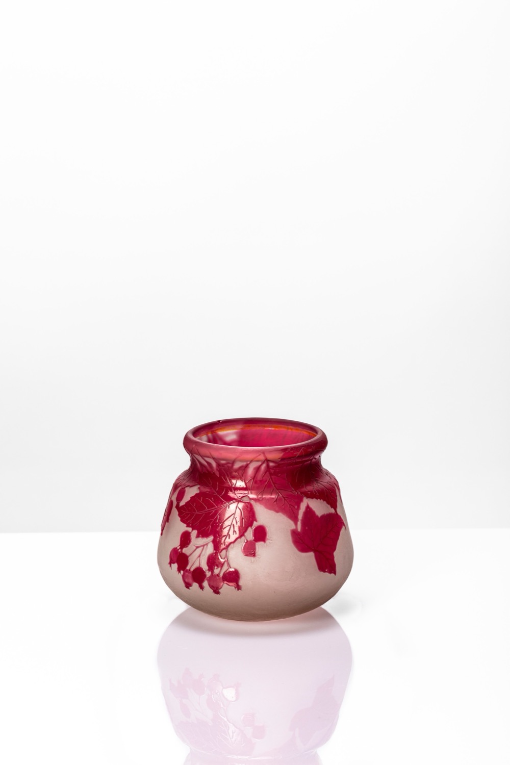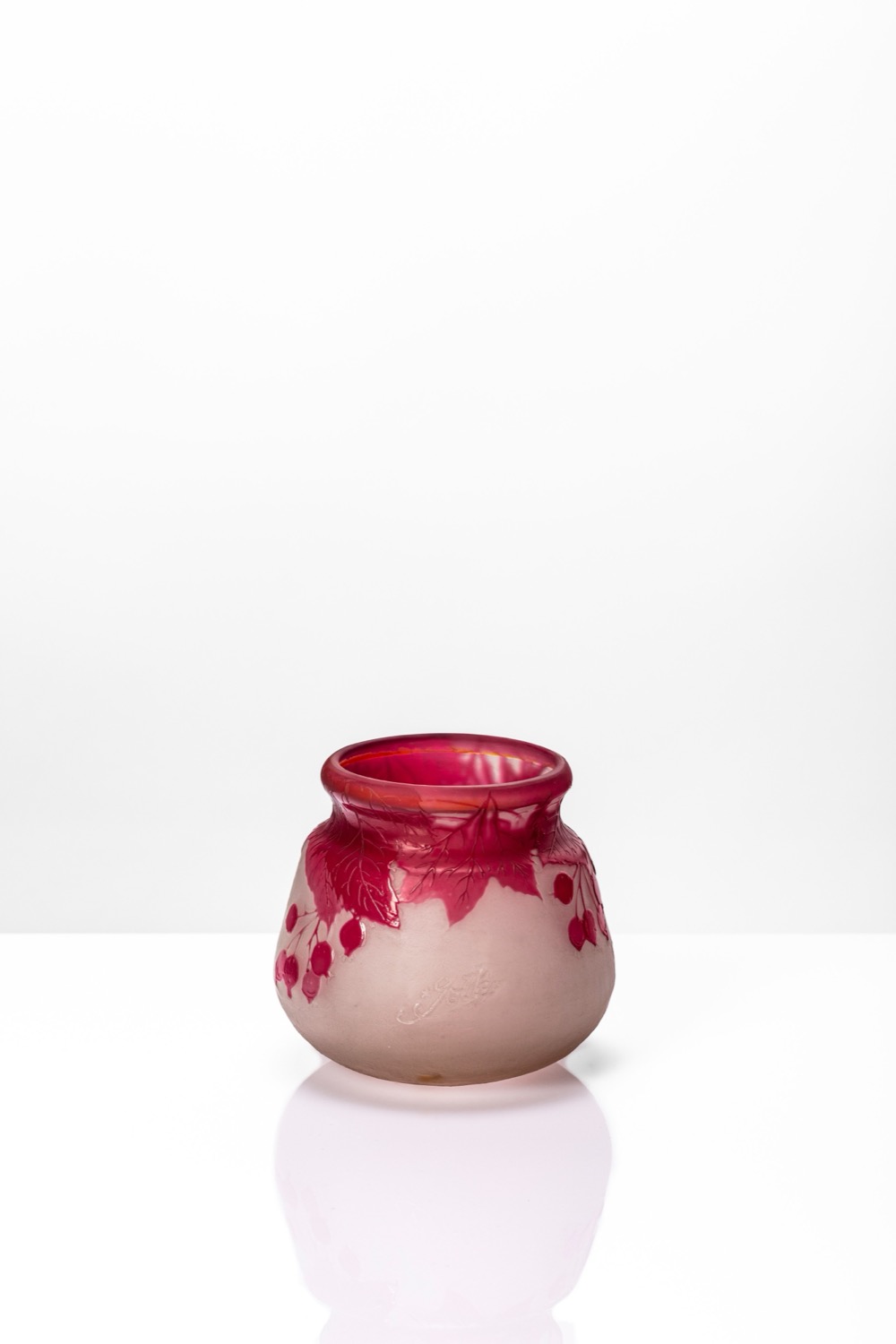 Vaso rastremato verso l'alto base circolare inciso ad acido doppio strato con decoro di bacche e vite selvatica