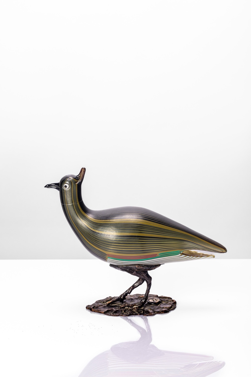 Scultura in vetro soffiato modello Pavoncella dalla serie Bestiario con decoro a canne policrome e base in fusione di bronzo patinato