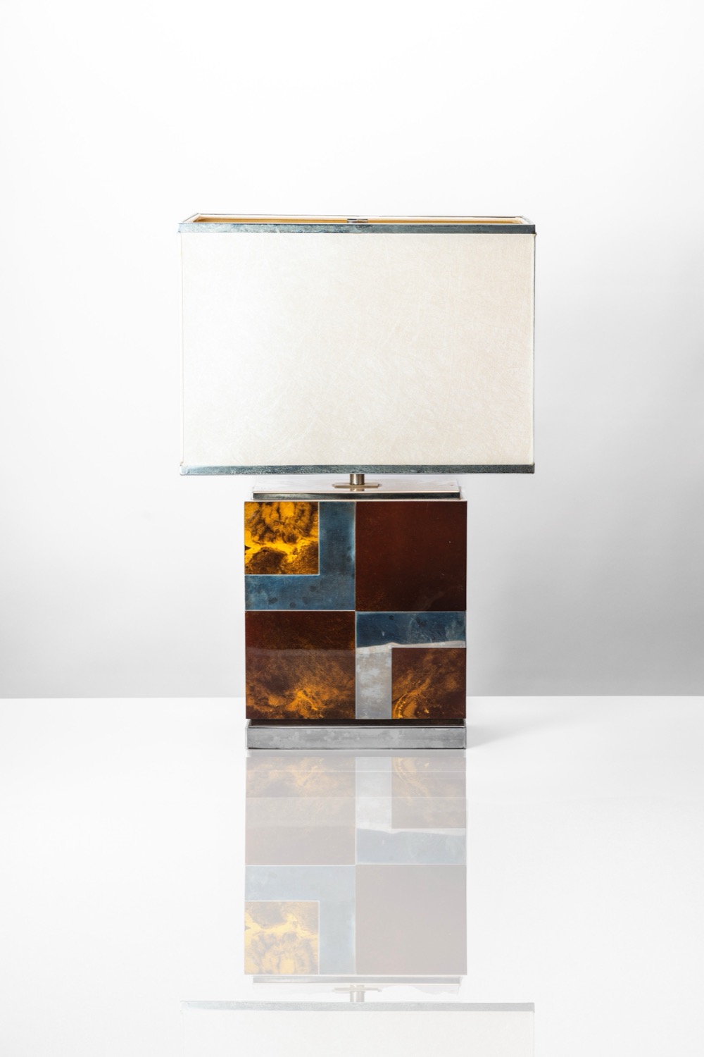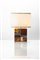 Lampada da tavolo con base in ottone cromato con inserti in radica e paralume originale in tessuto profilato
