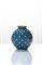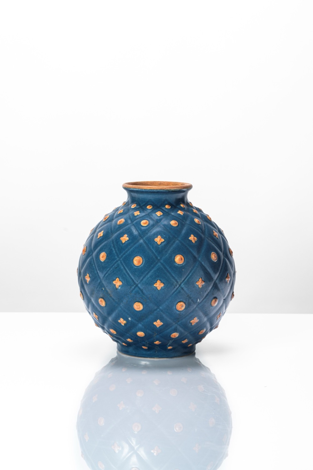 Vaso sferico in terraglia a colaggio con decoro a smalto blu ed applicazioni a bottone su rombi impressi