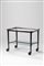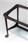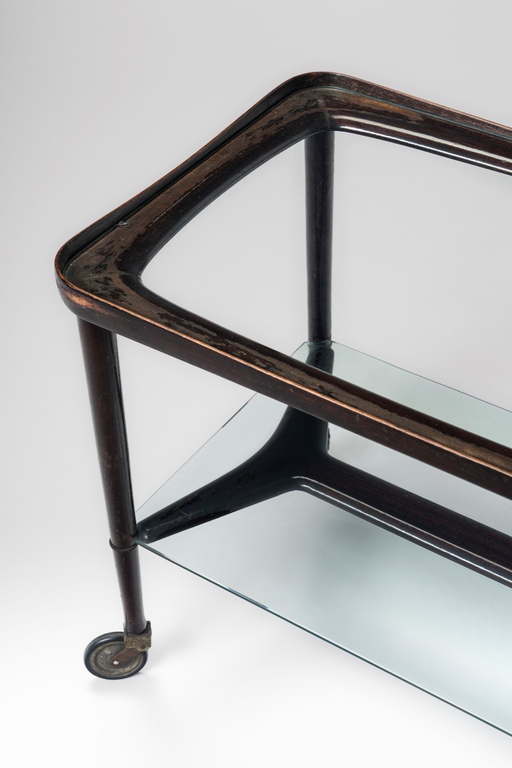Carrello da sala con struttura in legno sagomato e doppio ripiano in vetro