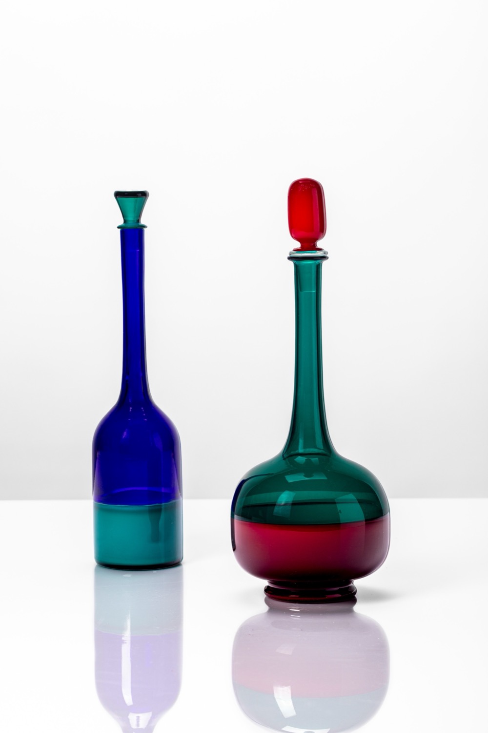 Coppia di bottiglie con tappo della serie Morandiana in vetro soffiato ad incalmo