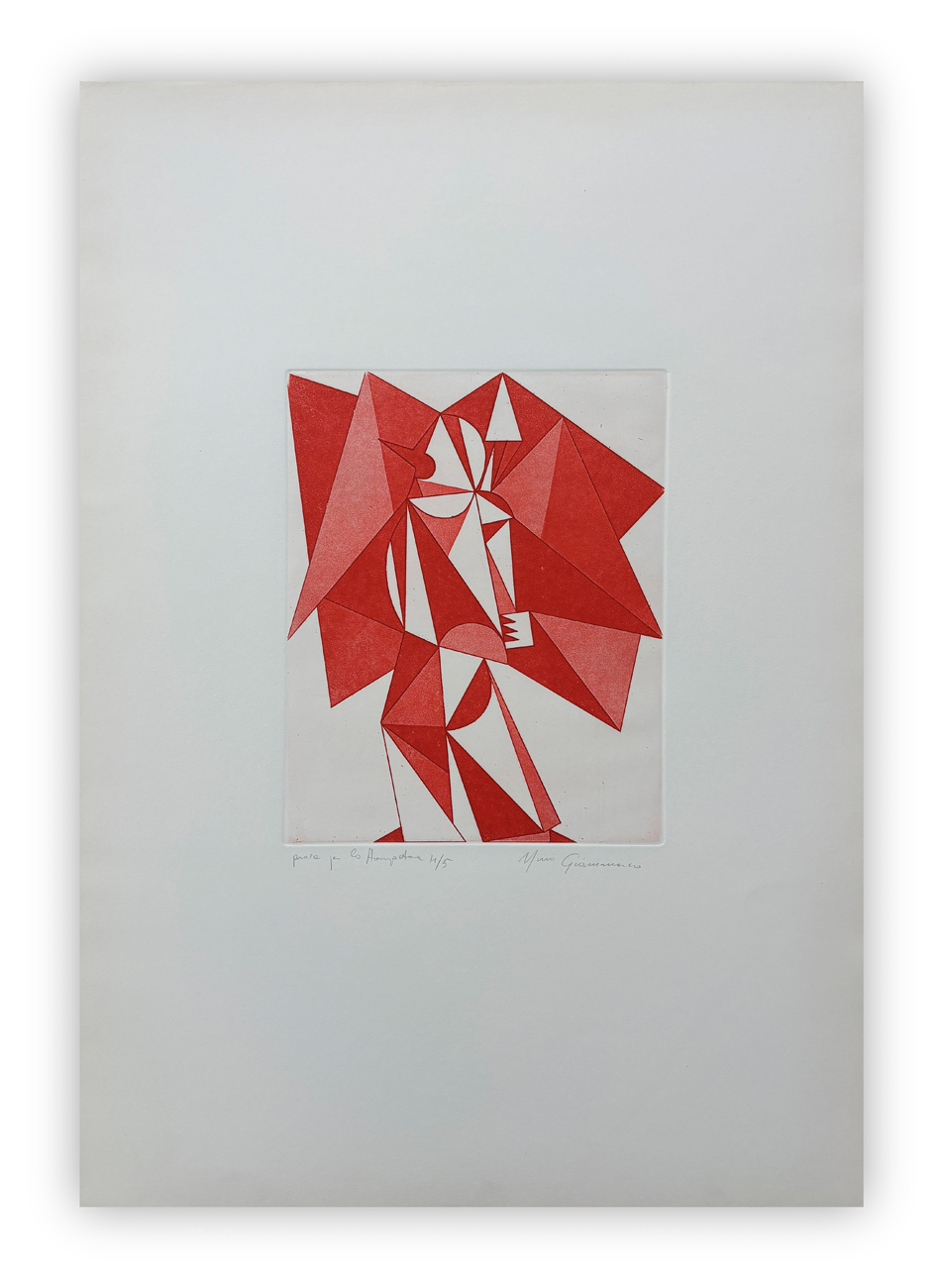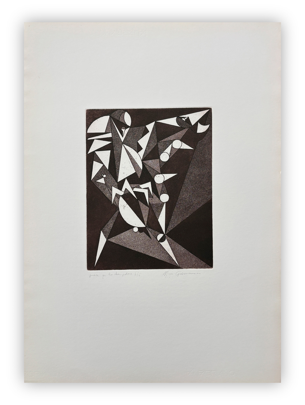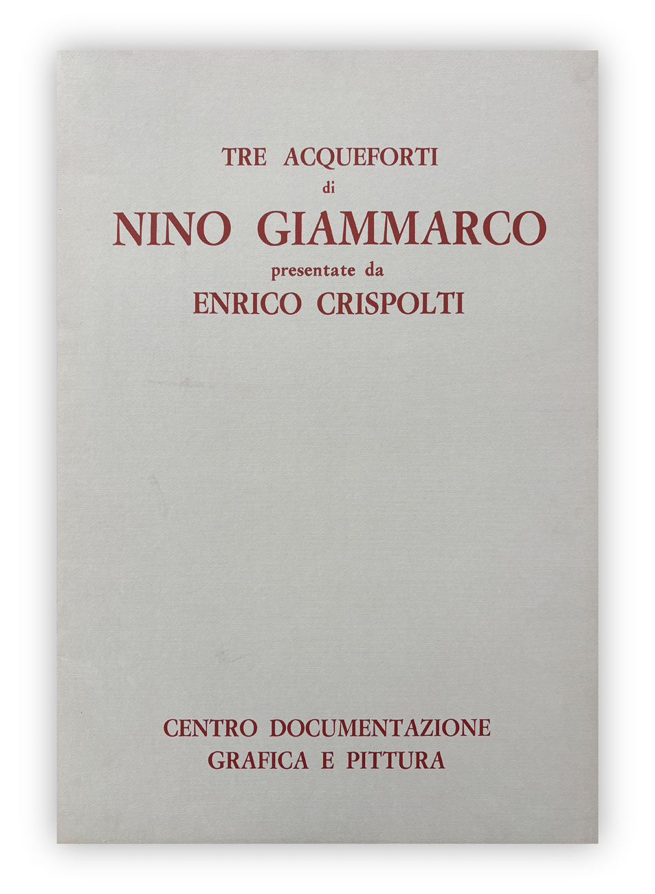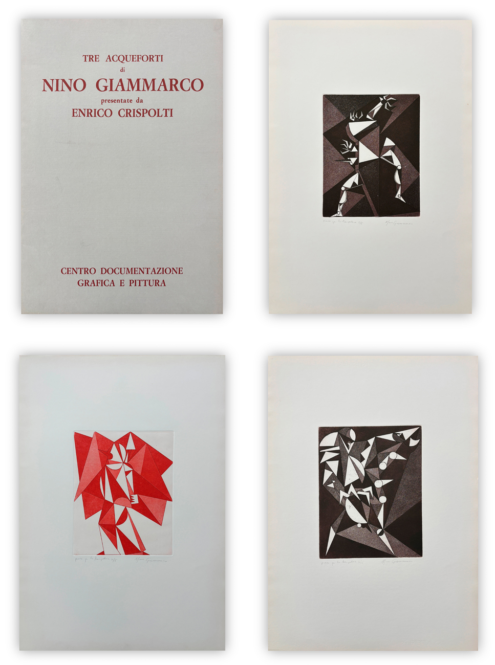 Cartella contenente 3 acqueforti di Nino Giammarco presentate da Enrico Crispolti, ciascuna recante firma e numerazione (Esemplare prova per lo stampatore 4/5) a matita al fronte
