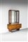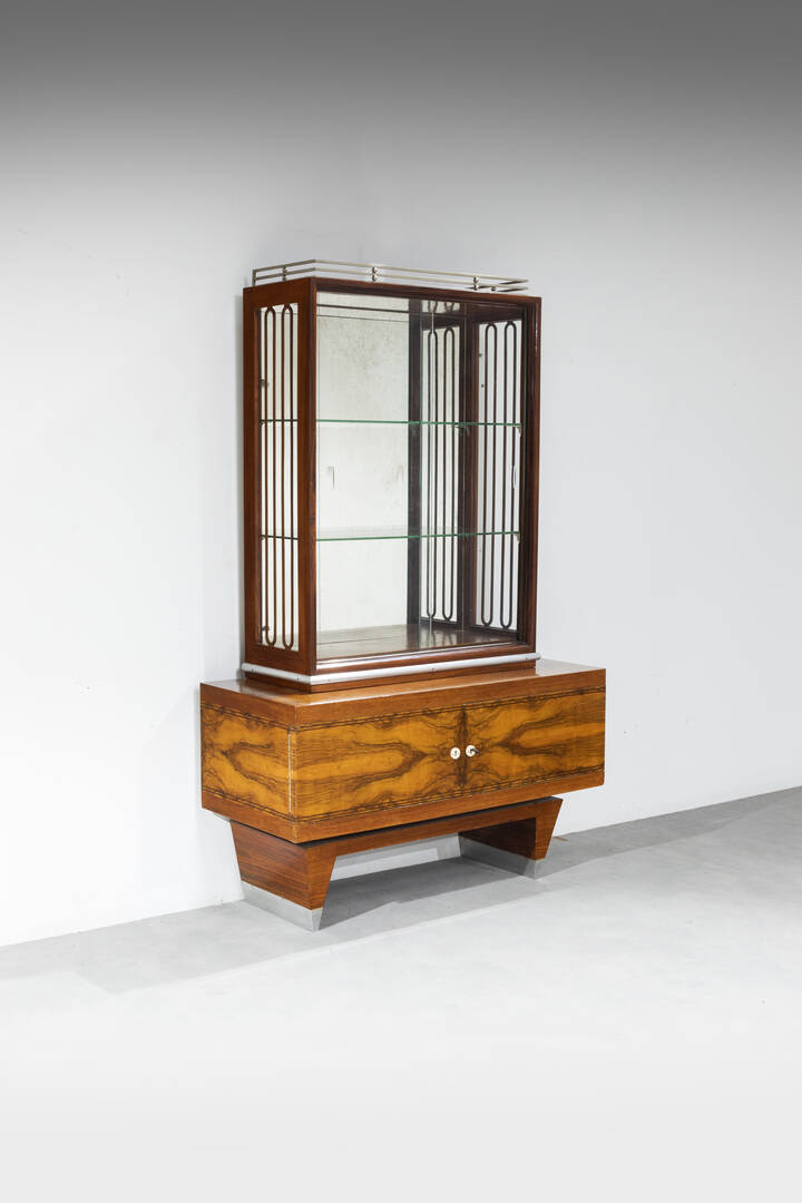 Struttura in legno e radica, particolari in alluminio, acciaio, vetro e vetro specchiato.