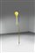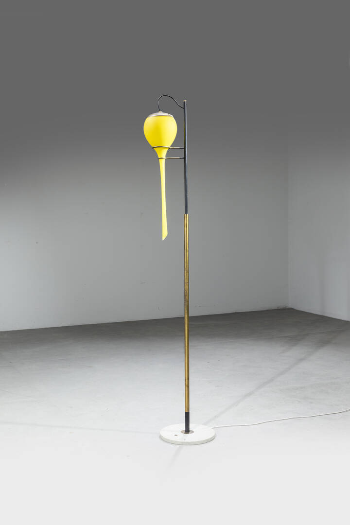 Struttura in metallo e ottone, paralume in vetro colorato e particolari in ottone.