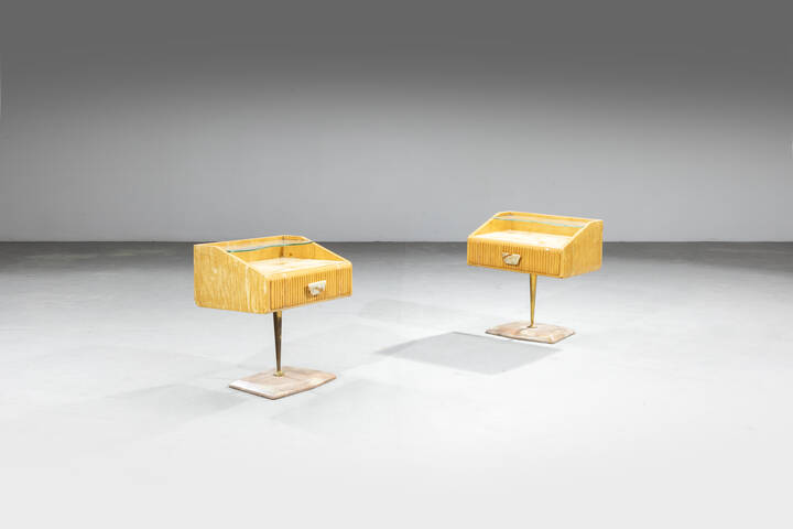 Struttura in legno e legno grissinato, piani in vetro e onice, particolari in ottone.