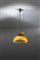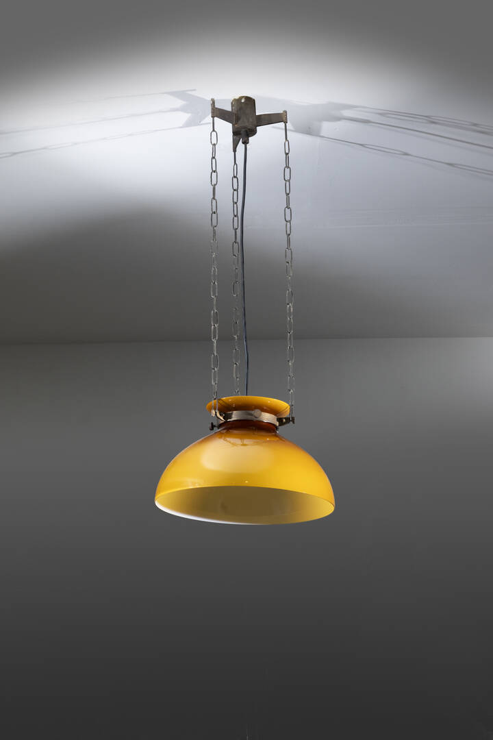 Vetro opalino e colorato, sostegni a catenella, particolari in ottone.
